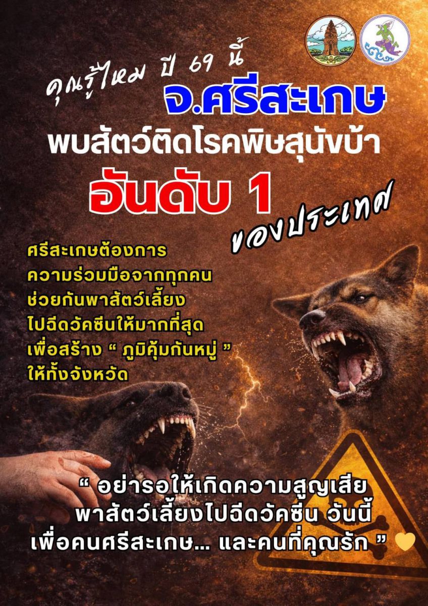 เมื่อวันที่ 24 ก.พ. 2569 นายสัตวแพทย์ นัทธ์เวโรจน์ บูชาพัฒน์ ปศุสัตว์จังหวัดศรีสะเกษ เปิดเผยว่า ขณะนี้ในพื้นที่ จ.ศรีสะเกษ พบการระบาดของโรคพิษสุนัขบ้าในสัตว์ ในพื้นที่ 6 อำเภอ คือ อ.เมืองศรีสะเกษ อ.พยุห์ อ.น้ำเกลี้ยง อ.กันทรารมย์ อ.วังหิน และอ.อุทุมพรพิสัย ซึ่งเกิดจากเชื้อ เรบี่ส์ไวรัส (Rabies virus) พบได้ในสัตว์เลี้ยงลูกด้วยนมทุกชนิด เช่น คน สุนัข หนู ลิง โค กระบือ เป็นต้น โดยมี สุนัข เป็นสัตว์พาหะนำโรคที่สำคัญ ปัจจุบันยังไม่มียารักษา แต่ป้องกันได้โดยการฉีดวัคซีน โดยอาการของสัตว์ที่ติดโรคพิษสุนัขบ้า ระยะเริ่มแรก จะพบว่า นิสัยเปลี่ยน หงุดหงิด และหวาดระแวง ระยะตื่นเต้น กัดไม่เลือก เห่าหอน และระยะอัมพาต น้ำลายไหล คางห้อยตก และตาย