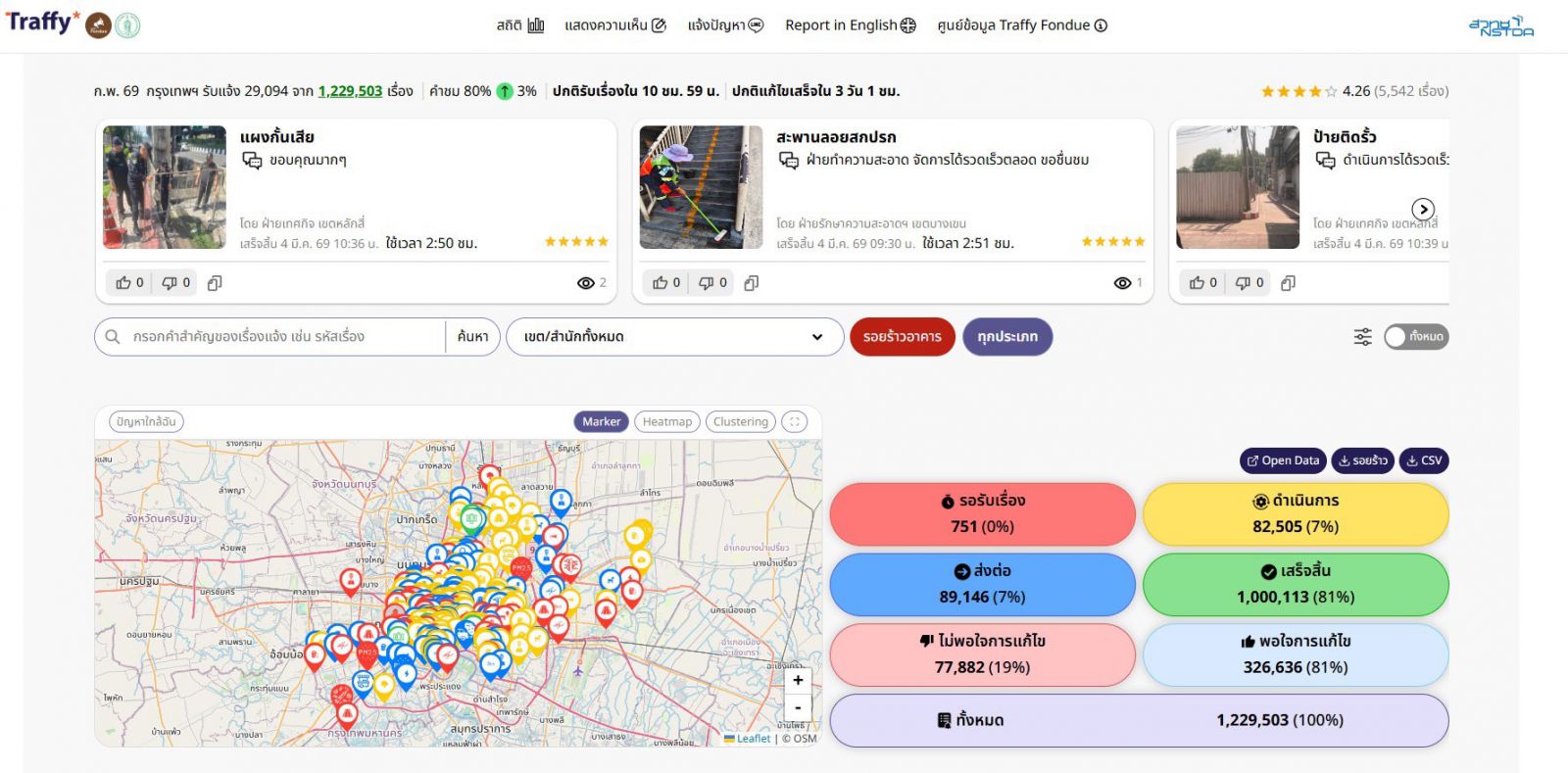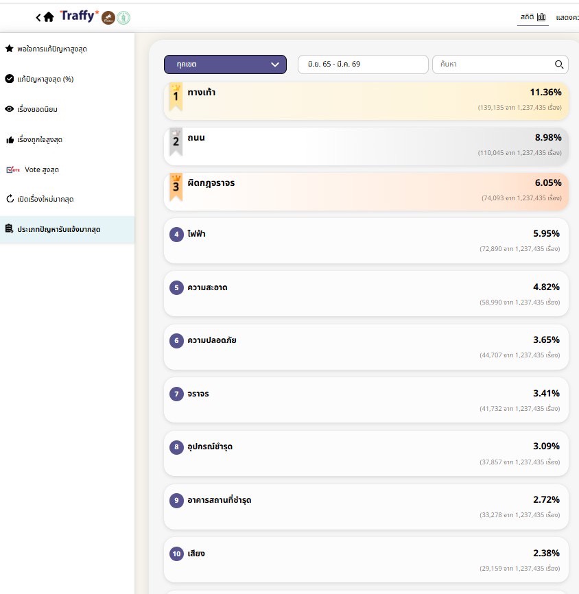 ในด้านความพึงพอใจ พบว่าประชาชนพึงพอใจการแก้ไข 326,636 เรื่อง (81%) และไม่พอใจ 77,882 เรื่อง (19%) ซึ่งข้อมูลทั้งหมดเปิดเผยแบบเรียลไทม์ สามารถติดตามสถานะได้ทุกขั้นตอน โดยสามารถดูสถิติได้ที่ https://bangkok.traffy.in.th/