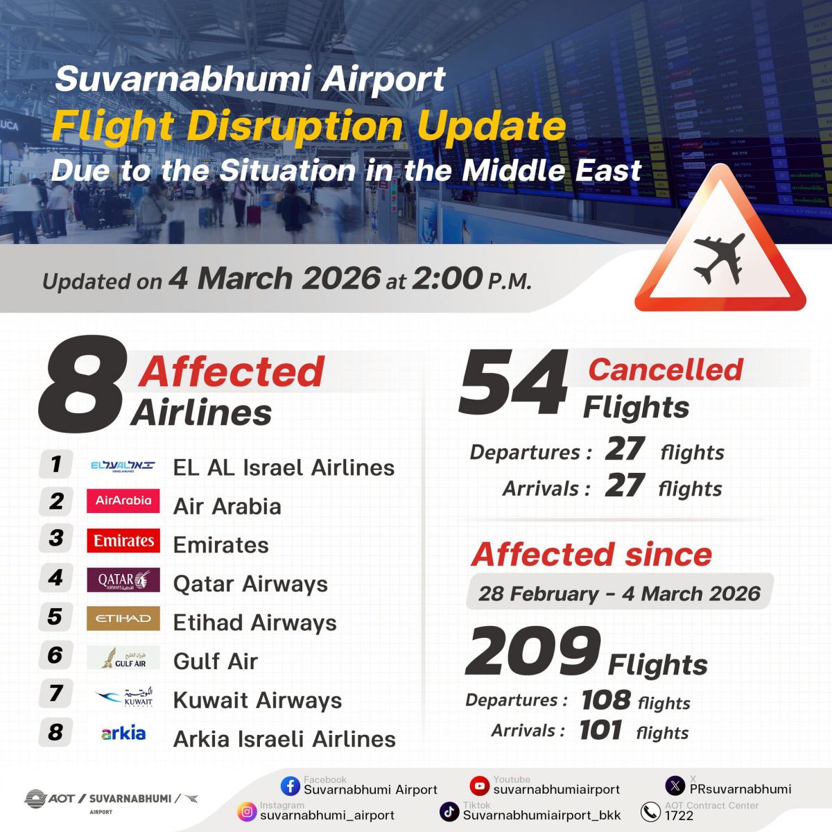 ยกเลิกเที่ยวบินรวม 54 เที่ยวบิน(ขาออก 27 เที่ยวบิน - Repatriation 1 เที่ยวบิน, ขาเข้า 27 เที่ยวบิน)ผลกระทบสะสมตั้งแต่วันที่ 28 กุมภาพันธ์ – 4 มีนาคม 2569รวมทั้งสิ้น 209 เที่ยวบิน(ขาออก 108 เที่ยวบิน, ขาเข้า 101 เที่ยวบิน)