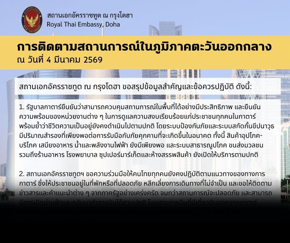 อัปเดตสถานการณ์และคำแนะนำสำหรับคนไทยในกาตาร์ (สถานะ ณ วันที่ 4 มี.ค. 2569 เวลา 17.15 น.)สถานเอกอัครราชทูต ณ กรุงโดฮา ขอสรุปข้อมูลสำคัญและข้อควรปฏิบัติ ดังนี้