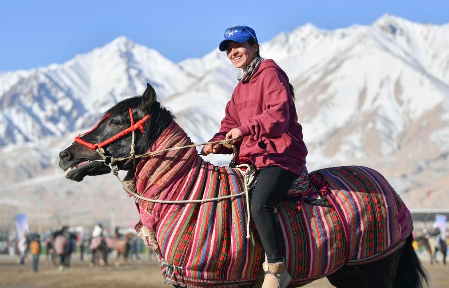 (แฟ้มภาพซินหัว : กูลิซา ดิฮัน จูงม้าของเธอเพื่อวอร์มอัพร่างกายก่อนเริ่มการแข่งขัน ในแคว้นปกครองกลุ่มชาติพันธุ์ทาจิก ทัชคูร์กัน เขตปกครองตนเองซินเจียงอุยกูร์ ทางตะวันตกเฉียงเหนือของจีน)