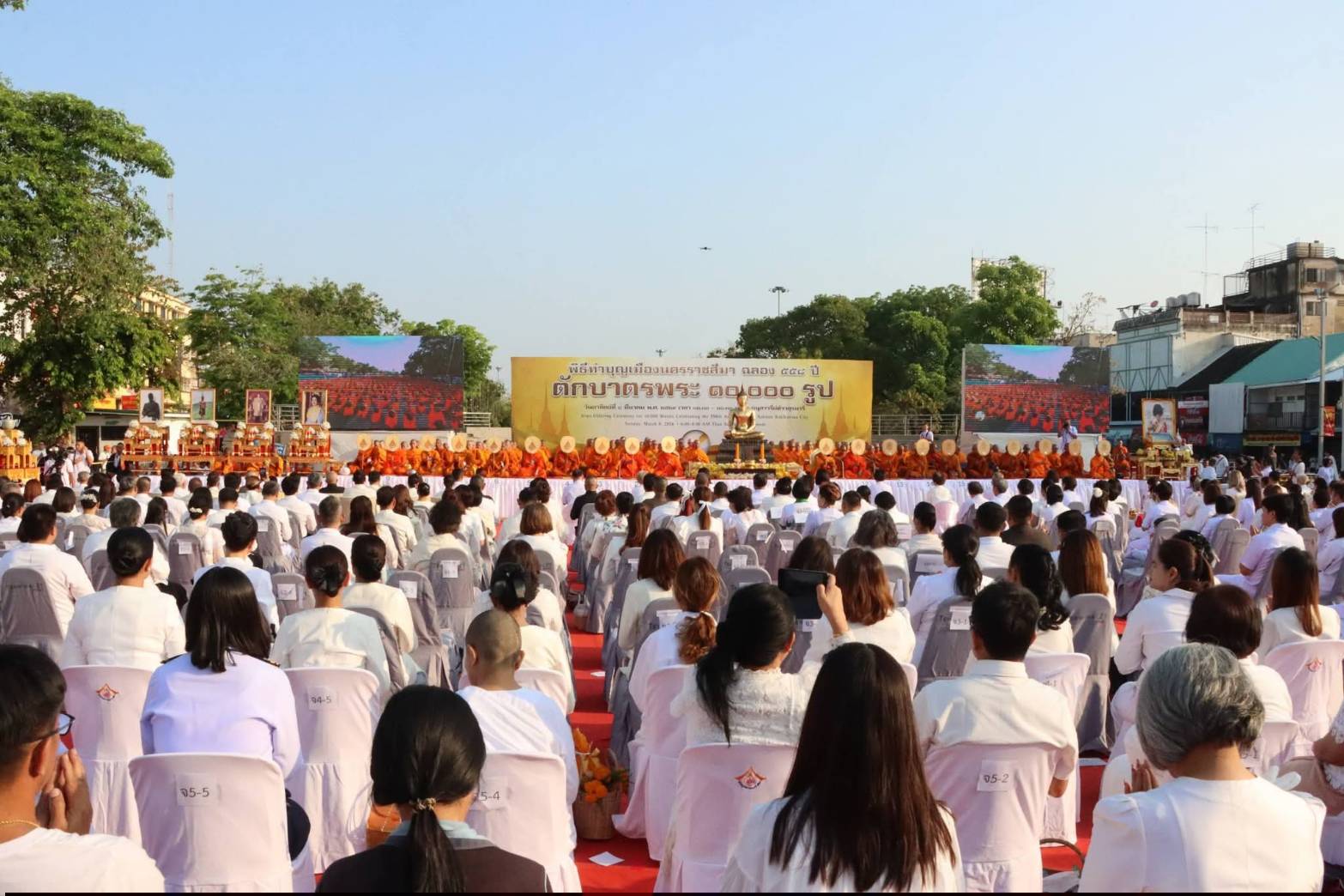 นครราชสีมา-เช้าวันนี้ (8 มีนาคม 2569) เวลา 06.00 น. บริเวณรอบ อนุสาวรีย์ท้าวสุรนารี หรือ “ลานย่าโม” อำเภอเมือง จังหวัดนครราชสีมา พุทธศาสนิกชนหลายหมื่นคนร่วมกันทำบุญครั้งยิ่งใหญ่ ตักบาตรพระสงฆ์จำนวน 10,000 รูป เนื่องในโอกาส สมโภชเมืองนครราชสีมา ครบรอบ 558 ปี