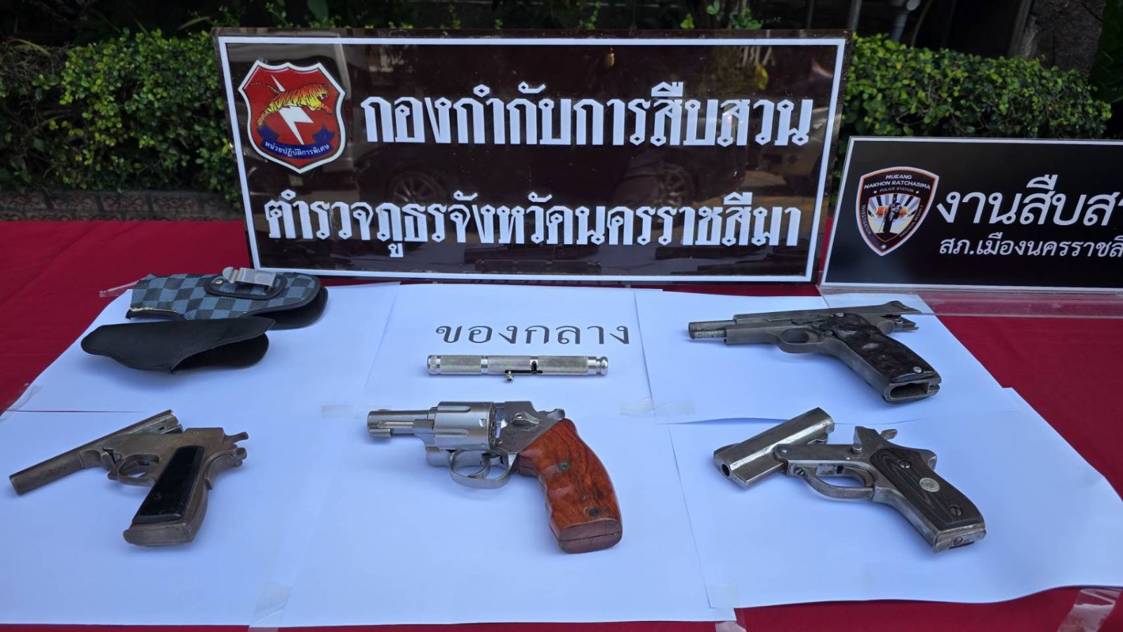 นครราชสีมา-เมื่อเวลา 14.00 น.วันจันทร์ที่ 9 มีนาคม 2569 ที่หน้ากองบังคับการตำรวจภูธรจังหวัดนครราชสีมา พล.ต.ต.ณรงค์ศักดิ์ พรหมทา ผบก.ภ.จว.นม,พ.ต.อ. อโณทัย จินดามณี รอง.ผบก.ภ.จว.นม , พ.ต.อ.ศิริชัย ศรีชัยปัญญา ผกก สภ.เมืองนครราชสีมา , พ.ต.ท.วิชานนท์ บ่อพิมาย รอง.ผกก.สส.ภ.จว.นม ร่วมกันแถลงข่าว จับกุมแก๊ง g5 วัยรุ่นใช้อาวุธปืนยิงกันกลางเมืองโคราช พร้อมของกลาง ปืน ไทยประดิษฐ์ 5 กระบอก มีดยาว 3 เล่ม มอเตอร์ไซค์ 5 คัน
