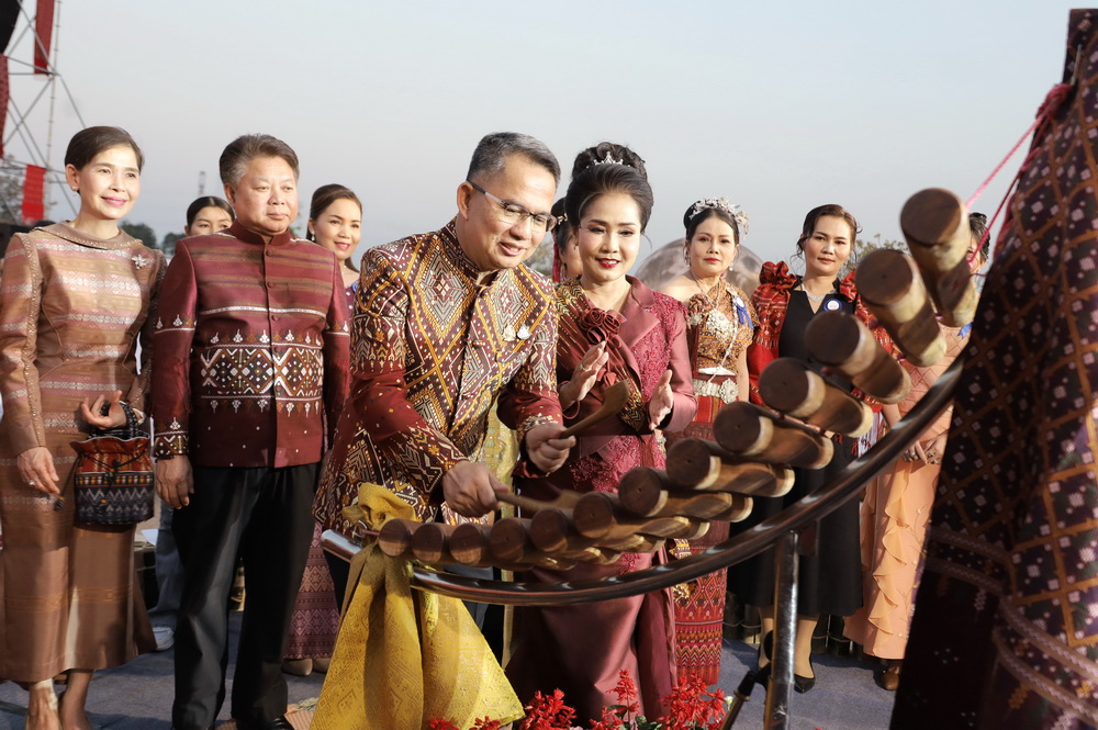 ที่เวทีกลาง งานมหกรรมโปงลาง แพรวา และงานกาชาด จ.กาฬสินธุ์ ประจำปี 2569 ศูนย์ราชการ จ.กาฬสินธุ์ นายสุวรรธณ์ เข็มธนเพ็ชร ผู้ว่าราชการ จ.กาฬสินธุ์ เป็นประธานตีโปงลาง เปิดงานแสดงแบบผ้าไทย ผ้าพื้นเมืองประจำถิ่น ของ จ.กาฬสินธุ์ "พราวพัสตรา แพรวากาฬสินธุ์ Silk Soul Sound @kalasin"