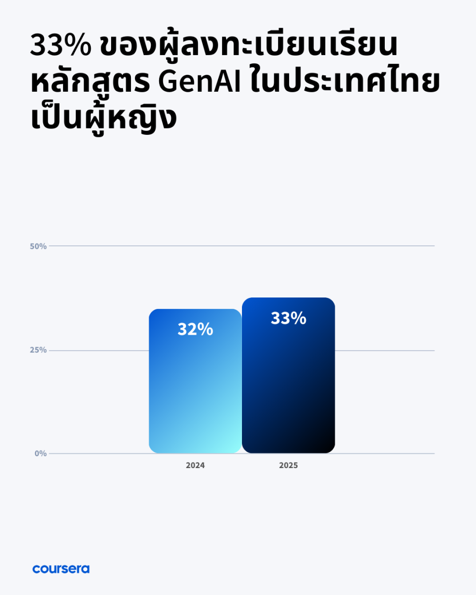 รายงานยังพบว่า ในปี 2025 ผู้หญิงคิดเป็น 33% ของผู้ลงทะเบียนเรียนหลักสูตร GenAI ทั้งหมดในประเทศไทย เพิ่มขึ้นจาก 32% ในปี 2024 หรือเพิ่มขึ้นหนึ่งเปอร์เซ็นต์ เมื่อเทียบกับปีก่อนหน้า ขณะเดียวกัน สัดส่วนของผู้เรียนหญิงบนแพลตฟอร์มที่เลือกลงทะเบียนเรียนหลักสูตร GenAI ก็เพิ่มขึ้นอย่างมีนัยสำคัญ จาก 37% ในปี 2024 เป็น 49% ในปี 2025 แม้ว่าช่องว่างทางเพศยังคงมีอยู่ แต่อัตราการเรียนจบที่สูงขึ้นและการมีส่วนร่วมที่เพิ่มขึ้นชี้ให้เห็นว่า อุปสรรคสำคัญอาจไม่ได้อยู่ที่ความสามารถหรือแรงจูงใจ แต่อยู่ที่โอกาสในการเข้าถึงการเรียนรู้ ซึ่งตอกย้ำถึงความจำเป็นในการลดข้อจำกัดและขยายโอกาสในการเรียนรู้ทักษะด้าน AI