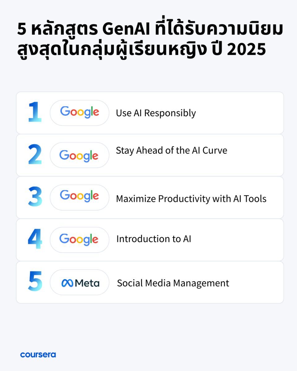 Courseraชี้ผู้หญิงไทยลงทะเบียนเรียน คอร์สGenAIเพิ่มจาก37%เป็น49%