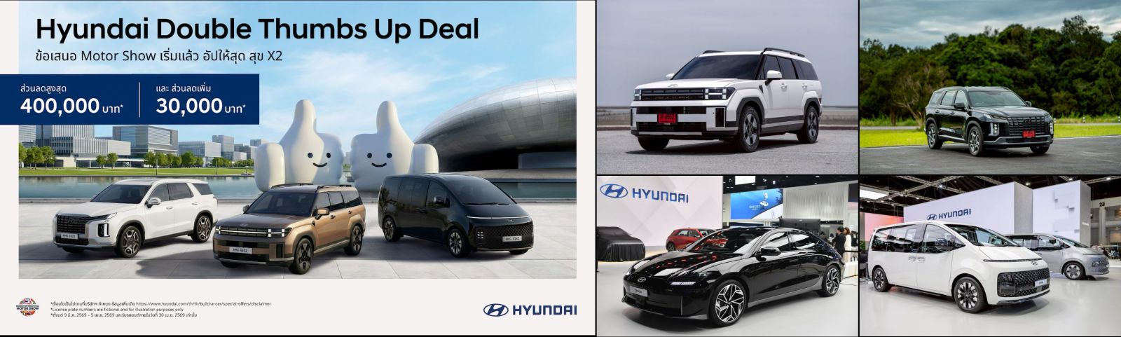 กรุงเทพฯ 10 มีนาคม 2569 — บริษัท ฮุนได โมบิลิตี้ (ประเทศไทย) จำกัด เปิดดีลแรง รับงานบางกอก อินเตอร์เนชั่นแนล มอเตอร์โชว์ ครั้งที่ 47 ปล่อยแคมเปญ “Hyundai Double Thumbs Up Deal อัปให้สุด สุข x2” จัดเต็มข้อเสนอแบบดับเบิล ด้วยส่วนลดสูงสุด 400,000 บาท* พร้อมส่วนลดเพิ่มอีก 30,000 บาท* สำหรับลูกค้าที่จองและรับรถยนต์ฮุนไดรุ่นที่ร่วมรายการ ให้ผู้ที่เล็งเป็นเจ้าของรถยนต์ฮุนไดในช่วงมอเตอร์โชว์ปีนี้ ได้รับความคุ้มค่าขั้นสุด โดยข้อเสนอสุดคุ้มนี้ สำหรับลูกค้าที่จองรถตั้งแต่วันนี้ – 5 เมษายน 2569 และรับรถภายในวันที่ 30 เมษายน 2569 ตามเงื่อนไขที่บริษัทกำหนด*