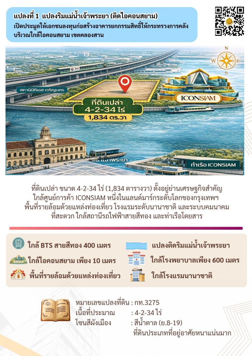 1. แปลงริมแม่น้ำเจ้าพระยา (ติดไอคอนสยาม) เปิดประมูลให้เอกชนลงทุนก่อสร้างอาคารยกกรรมสิทธิ์ให้กระทรวงการคลัง บริเวณใกล้ไอคอนสยาม เขตคลองสาน (ริมแม่น้ำเจ้าพระยา) ซึ่งเป็นที่ดินเปล่า ขนาด 4-2-34 ไร่ (1,834 ตารางวา) ตั้งอยู่บริเวณย่านเศรษฐกิจสำคัญริมแม่น้ำเจ้าพระยา ใกล้ศูนย์การค้า ICONSIAM หนึ่งในแลนด์มาร์กระดับโลกของกรุงเทพฯ พื้นที่รายล้อมด้วยแหล่งท่องเที่ยว โรงแรมระดับนานาชาติ และระบบคมนาคมที่สะดวก ใกล้สถานีรถไฟฟ้า BTS GOLD LINE และท่าเรือโดยสาร