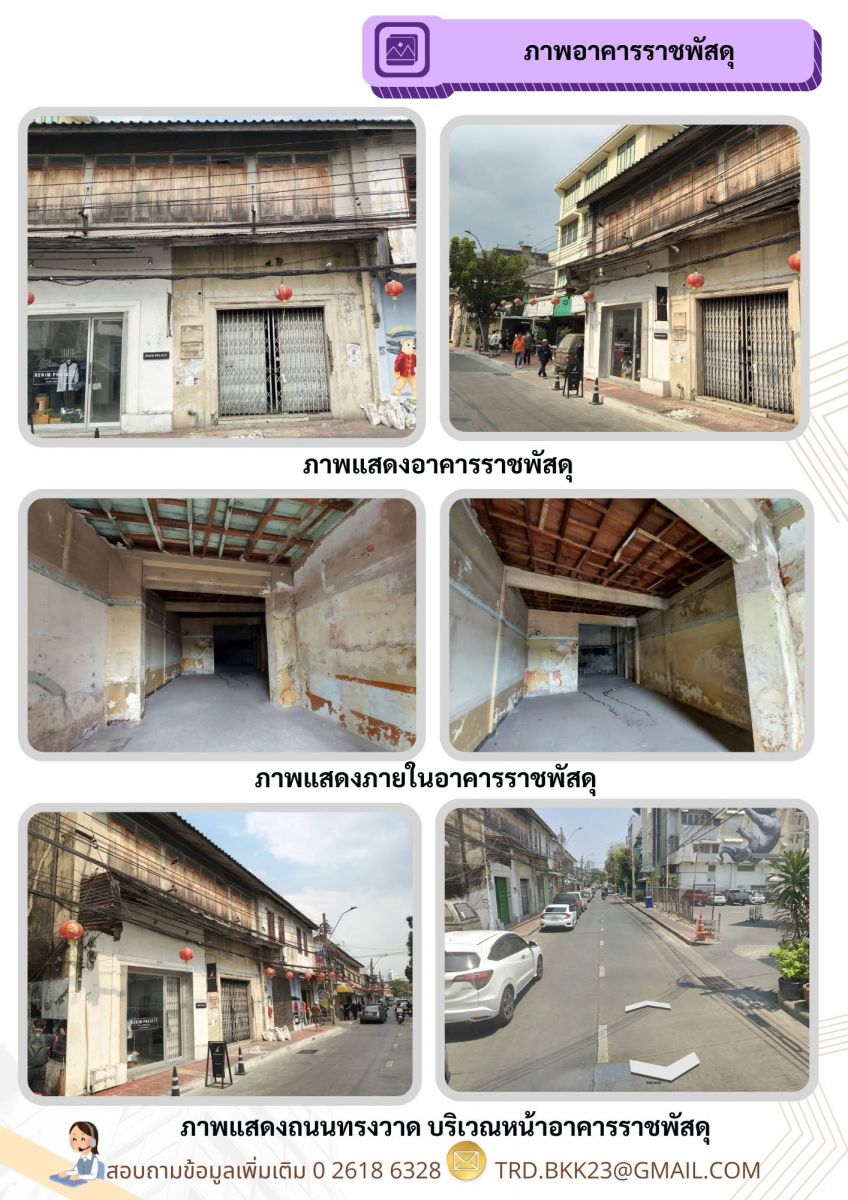 4. แปลงอาคารถนนทรงวาด เปิดประมูลสิทธิการเช่าอาคารราชพัสดุ บริเวณถนนทรงวาด เขตสัมพันธ์วงศ์ (บริเวณชั้น 1) เลขที่อาคาร 1067 เป็นอาคารราชพัสดุย่านเมื่องเก่าที่มีศักยภาพเติบโตสูง ขนาดพื้นที่ใช้สอย 90.40 ตารางเมตร ติดถนนทรงวาด ทำเลค้าขาย คนเดินผ่านตลอดวัน นักท่องเที่ยวไทย-ต่างชาติสัญจรตลอดปี รายล้อมแหล่งท่องเที่ยว คาเฟ่ และวัฒนธรรม อาทิ ไซน่าทาวน์ ตลาดน้อย เป็นโอกาสทองของธุรกิจยุคใหม่บนเสน่ห์เมืองเก่า เหมาะกับร้านอาหาร คาเฟ่ บาร์ สินค้าไลฟ์สไตล์