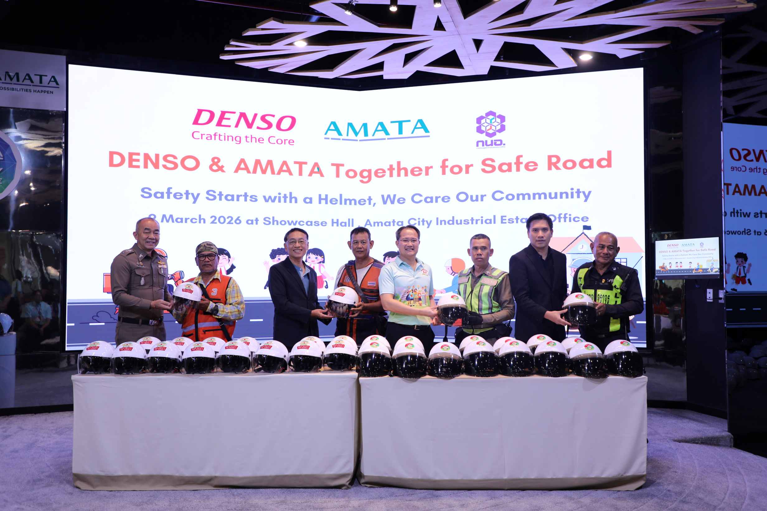 กรุงเทพฯ-ดร.ธีระวัฒน์ ลิมปิบันเทิง ประธานกรรมการ บริษัท สยาม เด็นโซ่ แมนูแฟคเจอริ่ง จำกัด และ นายอัครเรศร์ ชูช่วย ที่ปรึกษาฝ่ายงานชุมชนสัมพันธ์ บริษัท อมตะ คอร์ปอเรชัน จำกัด (มหาชน) ร่วมเป็นประธานในกิจกรรม “DENSO & AMATA Together for Safe Road” พร้อมด้วย วีระพงษ์ ด้วงพิบูลย์ ผู้อำนวยการสำนักงานนิคมอุตสาหกรรมอมตะซิตี้ ชลบุรี พันตำรวจเอก ชัยรัชช์กิตติ์ ชัยปฏิวัติ ผู้กำกับสถานีตำรวจภูธรพานทอง (สภ.พานทอง) จังหวัดชลบุรี ให้เกียรติร่วมงาน และร่วมมอบหมวกกันน็อกจำนวน 250 ใบ ให้แก่ ผู้ประกอบอาชีพวินรถจักรยานยนต์รับจ้าง อาสาจราจร เจ้าหน้าที่ตำรวจ และเยาวชนจากสถานศึกษาโดยรอบนิคมอุตสาหกรรม เพื่อรณรงค์การสวมหมวกนิรภัยและส่งเสริมความปลอดภัยในการใช้รถใช้ถนน จัดโดย อมตะ และ เด็นโซ่ ณ อาคารอมตะเซอร์วิสเซ็นเตอร์ นิคมอุตสาหกรรมอมตะซิตี้ ชลบุรี