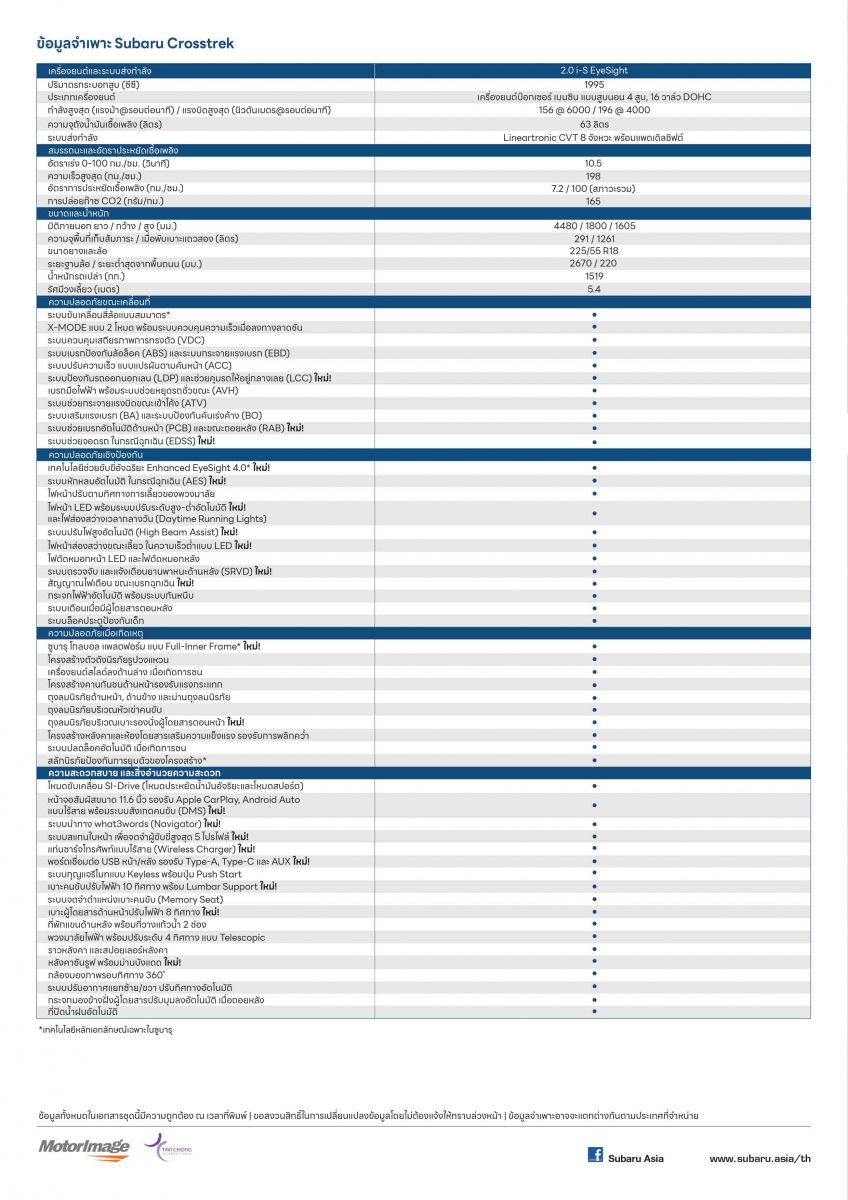 นางสาวสุรีทิพย์ ละอองทอง ผู้จัดการทั่วไป บริษัท ทีซี ซูบารุ (ประเทศไทย) จำกัด เปิดเผยว่า ซูบารุประเทศไทย เริ่มจำหน่ายรถรุ่นใหม่ หลังจากที่สต๊อกรถรุ่นประกอบในประเทศของบริษัทหมดลง โดยในปี 2568 ที่ผ่านมา ฟอเรสเตอร์ใหม่นำทัพลุยตลาดชูจุดขายเน้นคุณภาพของการประกอบในญี่ปุ่น โดดเด่นชัดเจนในเรื่องเทคโนโลยีความปลอดภัย เทคโนโลยีการขับขี่ NVH (Noise-Vibration-Harshness) และในปีนี้ซูบารุยังตอกย้ำเอาใจลูกค้าด้วยการนำครอสโอเวอร์ยอดนิยมทั้งในอเมริกาและญี่ปุ่นอย่าง ซูบารุ ครอสเทร็คใหม่ ที่มีความโดดเด่นในเรื่องเทคโนโลยีการขับขี่ NVH ที่เสริมในเรื่องความคล่องตัว รวมถึงเพิ่มเทคโนโลยีที่เหนือชั้นเทียบรถยนต์รุ่นธงอย่าง WRX และ OUTBACK อาทิ โครงสร้างตัวถังสองชั้น Full-Inner Frame ที่กำจัดและลด NVH ได้อย่างมีประสิทธิภาพ ขุมพลังใหม่ BOXER 2.0 ลิตร FB20 เจนใหม่ เครื่องยนต์สูบนอนที่มีศูนย์ถ่วงต่ำ ให้กำลังที่เหมาะสมแต่ประหยัดน้ำมันและบำรุงรักษาง่าย จับคู่กับเกียร์อัตโนมัติลิเนียร์ทรอนิก 8 สปีด Lineartronic TR58 และระบบพวงมาลัยไฟฟ้าแบบแกนคู่ Dual Pinion Electric Power Steering , ระบบขับเคลื่อนสี่ล้อตลอดเวลาแบบสมมาตร SAWD ที่ทำงานร่วมกับ X-Mode จนได้ระบบขับเคลื่อนที่ไปได้ทุกสภาพถนน, เทคโนโลยีช่วยเหลือผู้ขับ EyeSight 4.0 อัพเกรดเวอร์ชั่น เพิ่มกล้องเลนส์กว้าง Wide Angle Monocular Camera อีก 1 ตัว และเทคโนโลยีความปลอดภัยระดับแอดวานซ์ EDSS Emergency Driving Stop System ที่ช่วยประคองรถจอดฉุกเฉินในกรณีผู้ขับขี่หมดสติ หรือระบบการจดจำใบหน้าเพื่อปรับตำแหน่งการขับขี่และจดจำฟังก์ชั่นต่างๆ DMS Driver Monitoring System เพื่อให้การเริ่มต้นเดินทางสะดวกง่ายดายไม่ซับซ้อน