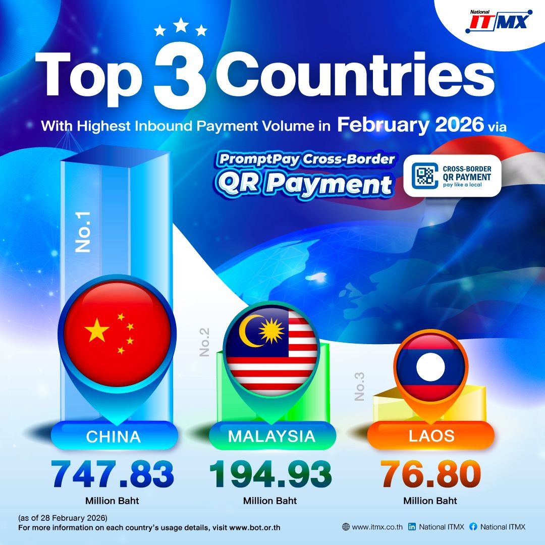 บริการ Cross-Border QR Payment ขาเข้า (Inbound) ในเดือนกุมภาพันธ์ 2569 มีมูลค่าธุรกรรมรวม 1,136.16 ล้านบาท เพิ่มขึ้นจาก 296.44 ล้านบาทในช่วงเดียวกันของปีก่อน คิดเป็นอัตราการเติบโต 283% YoY โดยอัตราการเติบโตในระดับสูงดังกล่าว สะท้อนถึงการขยายตัวของการใช้งานระบบชำระเงินข้ามพรมแดน อย่างมีนัยสำคัญ โดยเฉพาะในช่วงฤดูกาลท่องเที่ยวที่มีนักท่องเที่ยวต่างชาติเดินทางเข้ามาในประเทศไทยอย่างต่อเนื่อง ส่งผลให้การใช้จ่ายผ่าน QR Code เพิ่มสูงขึ้นตามไปด้วย