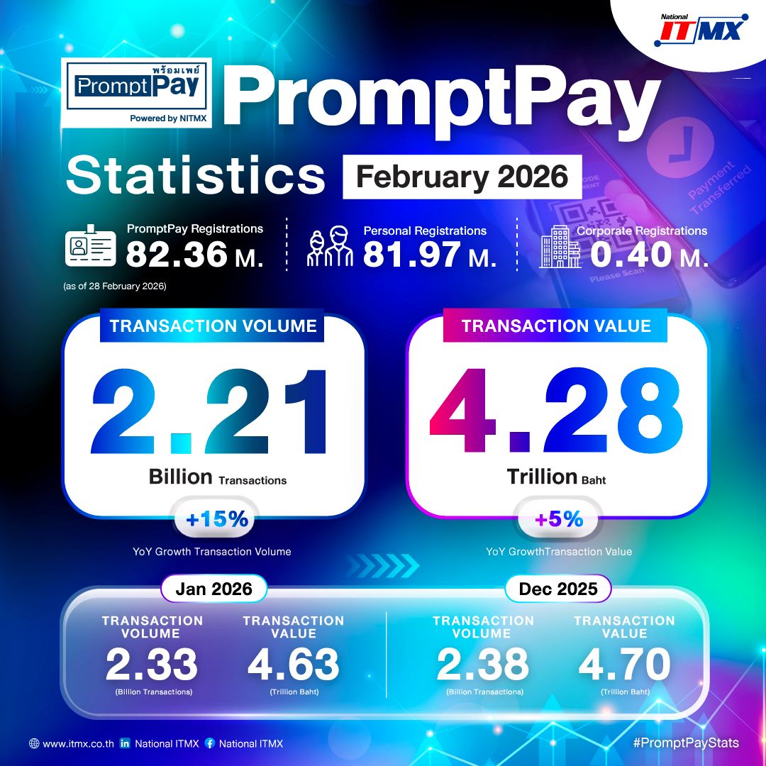 NITMXชี้ยอดธุรกรรมพร้อมเพย์ก.พ.69 แตะ2.21พันล้านรายการ4.28 ล้านล้านบ.