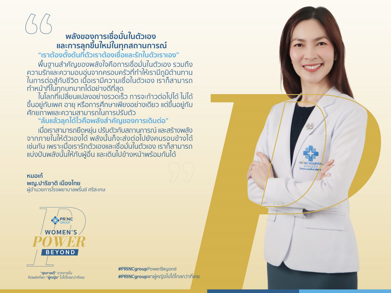 พญ.ปาริชาติ เมืองไทย ผู้อำนวยการโรงพยาบาลพริ้นซ์ ศรีสะเกษ กล่าวว่า “ก่อนจะก้าวมาสู่บทบาทผู้อำนวยการโรงพยาบาล หมอเก๋ผ่านการทำงานในหลายบทบาท ทั้งแพทย์เวชศาสตร์ครอบครัว และแพทย์ดูแลผู้ป่วยแบบประคับประคองประสบการณ์เหล่านี้ทำให้เข้าใจทั้งมิติของการรักษาและมิติของชีวิต สำหรับหมอเก๋ พลังสำคัญของผู้หญิงในโลกการทำงานวันนี้ ไม่ได้ขึ้นอยู่กับเพศ อายุ หรือการศึกษาเพียงอย่างเดียว แต่คือ ความเชื่อมั่นในตัวเอง และความสามารถในการลุกขึ้นใหม่เมื่อเผชิญกับความเปลี่ยนแปลง เมื่อเราสร้างพลังจากภายในให้ตัวเองได้ พลังนั้นก็สามารถส่งต่อไปยังผู้คนรอบข้างได้เช่นกัน เพราะทีมที่แข็งแรงไม่ได้เกิดจากความเหมือนกันทั้งหมด แต่เกิดจากการยอมรับ ความแตกต่างของความคิด เพศ และช่วงวัย เพื่อสร้างการทำงานที่เติบโตไปด้วยกัน”