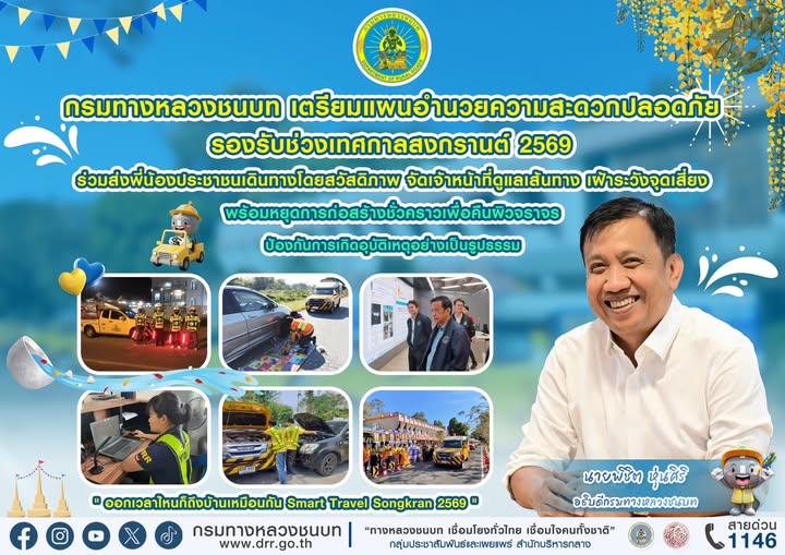 อย่างไรก็ตาม ทช. ได้เตรียมความพร้อมอำนวยความสะดวกและบรรเทาปริมาณการจราจรในช่วงเทศกาลสงกรานต์ 2569 ให้กับประชาชน พร้อมดำเนินการติดตั้งป้ายแนะนำเส้นทางเลี่ยงตามโครงข่ายทางหลวงชนบทเพื่อความสะดวกรวดเร็วในการเดินทาง สอบถามข้อมูลเพิ่มเติมหรือขอความช่วยเหลือได้ที่แขวงทางหลวงชนบท ในพื้นที่หรือสายด่วน ทช. โทร. 1146