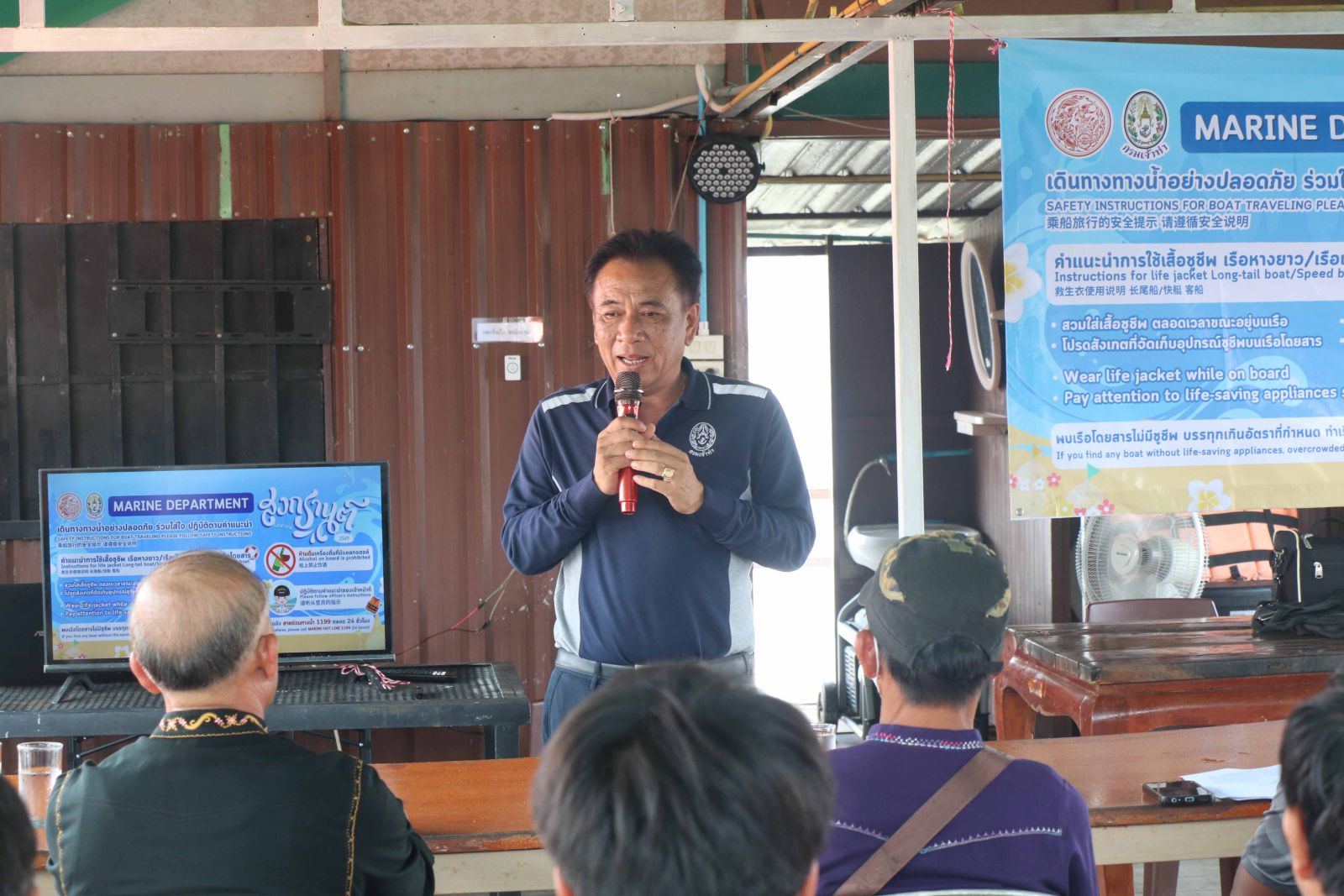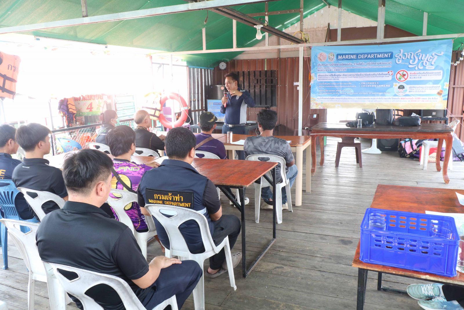 ที่แพไดโนเสาร์เรืองแสง ต.โนนบุรี อ.สหัสขันธ์ จ.กาฬสินธุ์ ส.ต.ท.สิทธิชัย พลไกรสร ผู้อำนวยการสำนักงานเจ้าท่าภูมิภาคสาขาขอนแก่น พร้อมเจ้าหน้าที่จากสำนักงานเจ้าท่าฯ จัดอบรมและให้คำแนะนำผู้ประกอบการ คนขับเรือเร็ว เรือหางยาว และเรือส่วนตัว ในพื้นที่สะพานเทพสุดา เขื่อนลำปาว ซึ่งได้รับความร่วมมือจากผู้ประกอบการแพอาหาร และบริการเรือเป็นอย่างดี