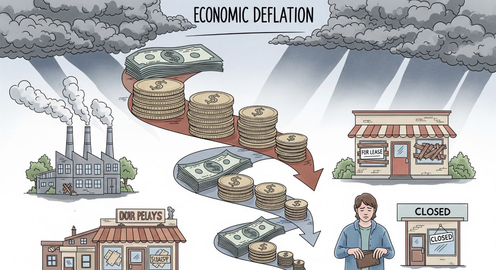 สิ่งที่เกิดขึ้นคือ “ภาวะเงินฝืด” (Deflation) ซึ่งเป็นหนึ่งในภาวะที่อันตรายที่สุดในระบบเศรษฐกิจ เพราะมันเพิ่มภาระของหนี้สินในเชิงมูลค่าที่แท้จริง