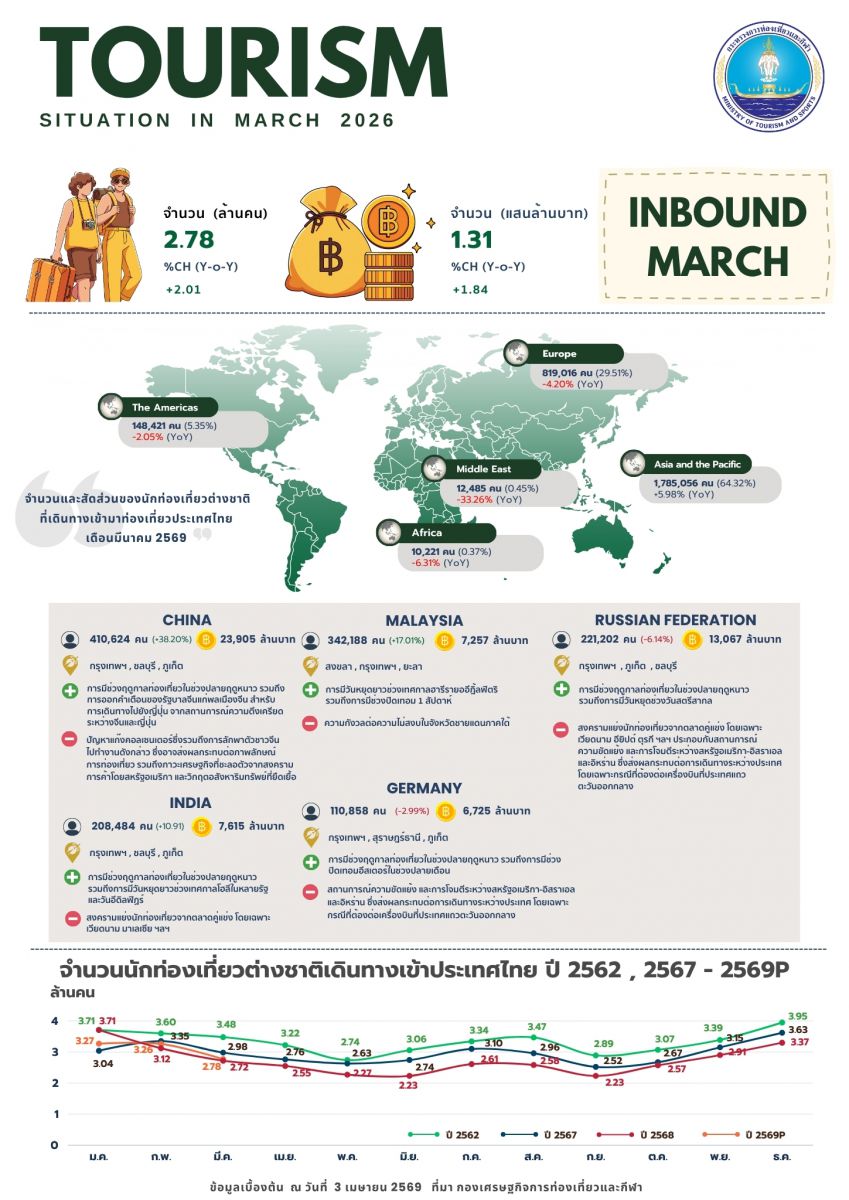 น.ส.นัทรียา ทวีวงศ์ ปลัดกระทรวงการท่องเที่ยวและกีฬา เปิดเผยว่า สถานการณ์ท่องเที่ยวในช่วงสัปดาห์ที่ผ่านมา (30 มี.ค.-5 เม.ย. 69) นักท่องเที่ยวชะลอตัวด้านการเดินทาง โดยเฉพาะนักท่องเที่ยวกลุ่มตลาดระยะใกล้ (Short haul) อาทิ มาเลเซีย ที่เดินทางเข้ามาลดลง จากผลกระทบต่อความเชื่อมั่นของข่าวสารการไม่มีน้ำมันจำหน่ายในสถานีบริการของไทย ซึ่งส่งผลให้ทัวร์บัสจากมาเลเซีย ยกเลิกมาท่องเที่ยวไทย แต่นักท่องเที่ยวตลาดมาเลเซีย ยังคงเดินทางเข้ามาท่องเที่ยวเป็นอันดับที่ 2 และท่องเที่ยวสะสม แตะระดับ 1 ล้านคนแล้วในสัปดาห์ที่ผ่านมา