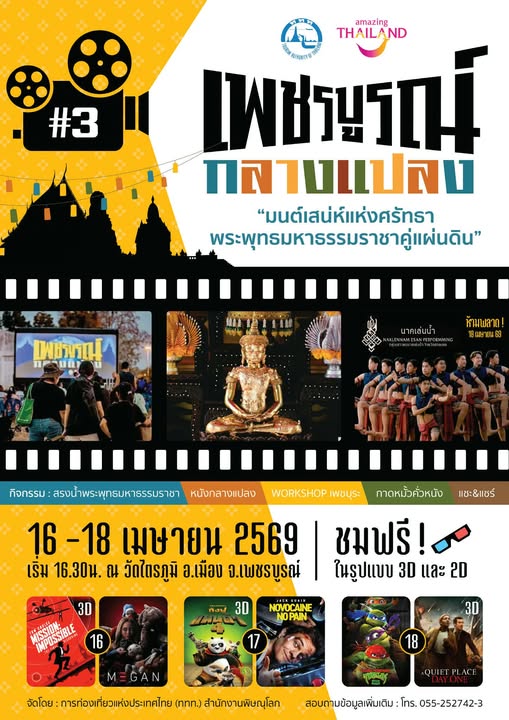 สายหนัง ห้ามพลาด ! เตรียมไปเจอกันในงาน "เพชรบูรณ์กลางแปลง #3"สรงน้ำพระมหาธรรมราชา | ทำตุงไส้หมู | เดินตลาดกลางแปลง | ดูหนัง 3D ฟรี!ณ วัดไตรภูมิ จ.เพชรบูรณ์