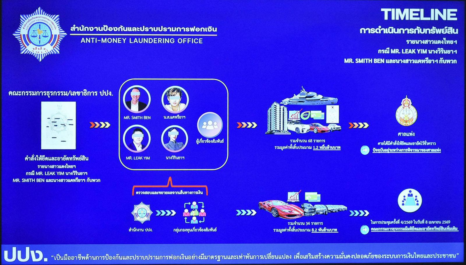 นายกรัฐมนตรีกล่าวขอบคุณหน่วยงานที่เกี่ยวข้องที่บูรณาการทำงาน จนสามารถขยายผลเส้นทางการเงินของกลุ่มผู้ต้องหา นำไปสู่การยึดและอายัดทรัพย์สิน รวมมูลค่าทั้งสิ้นกว่า 2 หมื่นล้านบาท จากการยึดทรัพย์ 2 ครั้ง โดยครั้งแรกจำนวน 68 รายการ มูลค่าทั้งสิ้น 1.2 หมื่นล้านบาท และครั้งที่ 2 เพิ่มเติม 34 รายการ มูลค่ารวม 8.2 พันล้านบาท โดยนายกรัฐมนตรีในฐานะกำกับดูแลสำนักงาน ปปง. ได้กำชับให้ทุกหน่วยงานกำหนดมาตรการ และบังคับใช้กฎหมายอย่างเคร่งครัด ยึดแนวทาง “ปิดชื่อ ถือพฤติกรรม” โดยขอให้สำนักงาน ปปง. และหน่วยงาน ที่เกี่ยวข้องดำเนินการต่อไปนี้