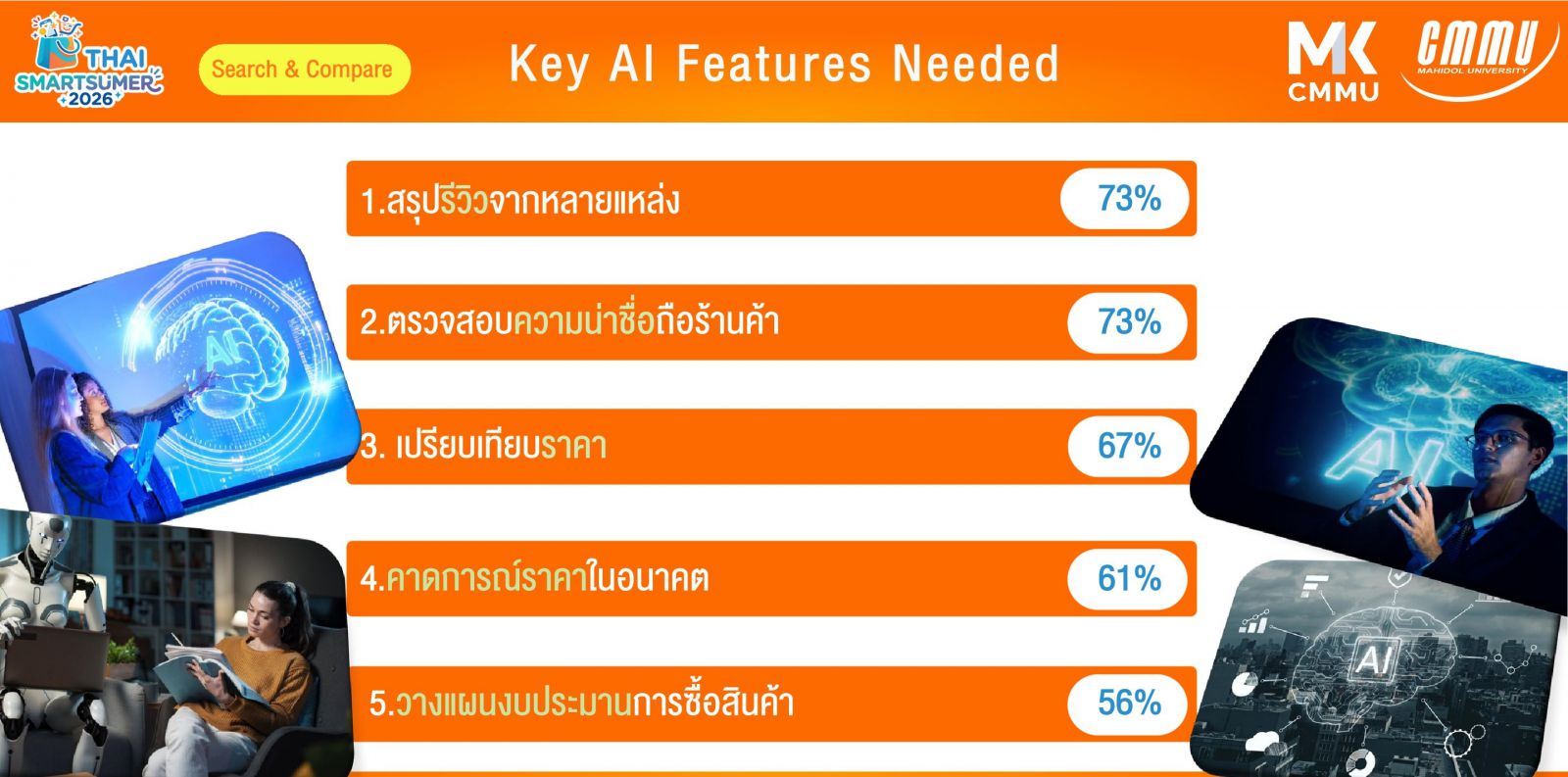 ด้าน นายสิทธิกร ยิ่งเมืองมาร นักศึกษาปริญญาโท วิทยาลัยการจัดการ มหาวิทยาลัยมหิดล (CMMU) และหัวหน้าทีมวิจัย กล่าวว่า ผลการวิจัยในครั้งนี้สะท้อนว่า AI กำลังมีบทบาทในการเป็นแหล่งข้อมูลหลักของผู้บริโภคในการตัดสินใจซื้อ ดังนั้นแบรนด์สินค้าและร้านค้าปลีกต้องปรับตัวและต้องเข้าใจถึงพฤติกรรมของผู้บริโภคยุค SmartSumer ผ่านการออกแบบกลยุทธ์หรือการใช้เครื่องมือสื่อสารที่เข้าใจถึงพฤติกรรมของผู้บริโภคคือ