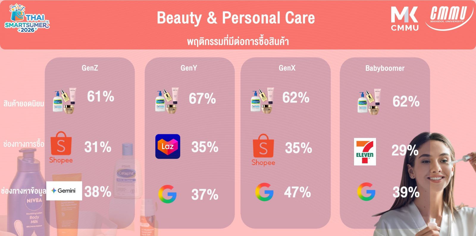 ·Beauty & Personal Care เป็นหมวดสินค้าที่ผู้บริโภค 72-86% ให้ความสำคัญกับคุณภาพและผลลัพธ์จริง และกว่า 30% ใช้ AI ถึง 2 ระบบ คือ Chat GPT หรือ Google Gemini เพื่อร่วมวิเคราะห์ส่วนผสมในตัวผลิตภัณฑ์อย่างจริงจัง สะท้อนถึงพฤติกรรมผู้บริโภคที่เปลี่ยนจาก Brand Image-driven สู่ Ingredient-conscious และ AI-assisted Analysis ขณะเดียวกันการรีวิวจากผู้ใช้จริงและคอนเทนต์ออนไลน์เป็นปัจจัยหลักช่วยสร้างความเชื่อถือให้แก่แบรนด์ บ่งบอกถึงพฤติกรรมการตัดสินใจซื้อที่ขับเคลื่อนด้วยข้อมูลและประสบการณ์จริง