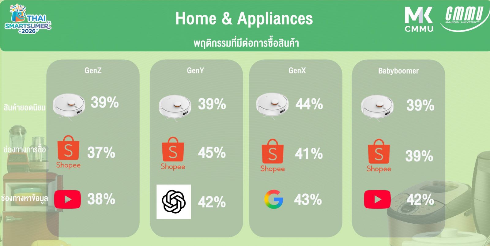 ·Home & Appliances เครื่องใช้ในบ้านเป็นหมวดสินค้าที่ผู้บริโภคใช้เวลาตัดสินใจนานที่สุด สะท้อนพฤติกรรมคิดก่อนซื้ออย่างชัดเจน โดย 85.5% ค้นหาข้อมูลก่อนซื้อและ 90-97% ศึกษาข้อมูลเชิงลึกก่อนตัดสินใจ เนื่องจากเป็นสินค้าที่เน้นความทนทานและความคุ้มค่าในระยะยาว โดยใช้เวลาตัดสินใจเฉลี่ย 1-4 สัปดาห์ ขณะเดียวกัน YouTube กลายเป็นแหล่งค้นหาข้อมูลมาเป็นอันดับ 1 สะท้อนว่า คอนเทนต์ Video Review หรือ การสาธิตการใช้สินค้า (Demo) มีอิทธิพลสูงสุดต่อการตัดสินใจซื้อ โดยมีสินค้ายอดนิยมได้แก่ เครื่องดูดฝุ่นและหุ่นยนต์ดูดฝุ่น