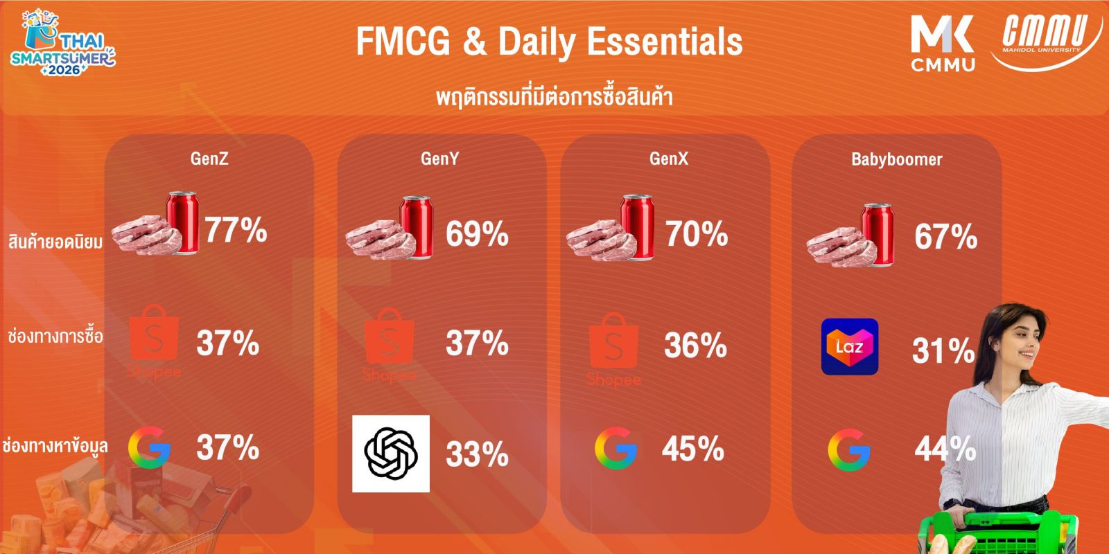 รองศาสตราจารย์ ดร.พัลลภา ปีติสันต์ หัวหน้าสาขาการตลาด วิทยาลัยการจัดการ มหาวิทยาลัยมหิดล (CMMU) เปิดเผยว่า การวิจัย THAI SMARTSUMER 2026 เมื่อผู้บริโภค ‘ฉลาดขึ้น’เกมธุรกิจต้องเปลี่ยน’ ได้ทำการศึกษาพฤติกรรมผู้บริโภคในยุคเศรษฐกิจดิจิทัลที่ปัจจุบันมีความผันผวนสูง ทั้งค่าครองชีพ เทคโนโลยีและการแข่งขันของแบรนด์สินค้าที่รุนแรง โดยพบว่าผู้บริโภคกำลังเผชิญแรงกดดันทางเศรษฐกิจทั้งค่าครองชีพจากราคาพลังงานที่ปรับตัว ภาระหนี้ครัวเรือนที่เพิ่มขึ้น รายได้ที่ไม่สอดคล้องกับรายจ่าย ส่งผลให้ “ความคุ้มค่า” (Value for Money) กลายเป็นปัจจัยหลักในการตัดสินใจซื้อสินค้าและบริการของผู้บริโภคไทยอย่างมีนัยสำคัญ และผู้บริโภคได้เปลี่ยนผ่านจากการตัดสินใจเชิงอารมณ์ (Emotional-driven) สู่การตัดสินใจบนพื้นฐานของเหตุผล ข้อมูลและการนำเทคโนโลยีมาใช้เป็นเครื่องมือหลักในการตัดสินใจ โดยเฉพาะการนำ AI เข้ามาเป็นเครื่องมือช่วยวิเคราะห์และเปรียบเทียบก่อนตัดสินใจซื้อ สะท้อนการก้าวเข้าสู่ยุค “Smartsumer” หรือผู้บริโภคที่คิด วิเคราะห์ เลือกอย่างมีเหตุผลมากขึ้น เลิกยึดติดกับราคาแต่มองถึงความคุ้มค่ารอบด้าน ปรากฏการณ์ดังกล่าวไม่ได้จำกัดอยู่เฉพาะกลุ่มคนรุ่นใหม่ แต่เป็นการเปลี่ยนแปลงที่เกิดขึ้นในผู้บริโภคทุกช่วงวัย ตั้งแต่ Baby Boomer, Gen X, Gen Y ไปจนถึง Gen Z สะท้อนถึงการเปลี่ยนแปลงเชิงโครงสร้างของพฤติกรรมผู้บริโภคไทยในภาพรวม