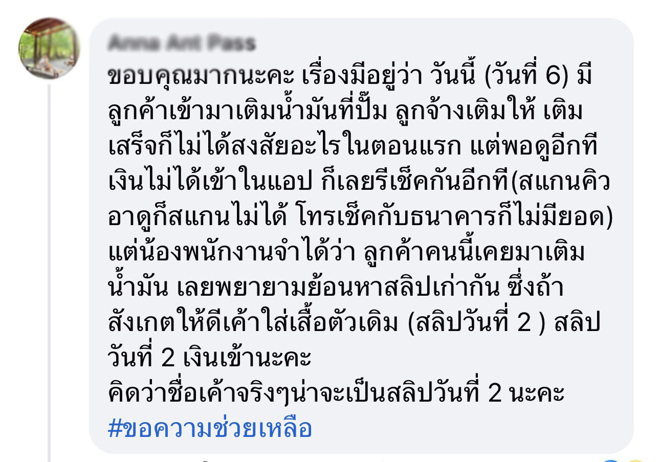 พนักงานยังระบุว่า จำหน้าลูกค้าคนนี้ได้แม่นยำเพราะเคยมาเติมน้ำมันก่อนหน้านี้ เมื่อลองย้อนหาสลิปเก่าพบว่า เมื่อวันที่ 2 เมษายนที่ผ่านมา ชายคนเดิมเคยมาเติมน้ำมันและโอนเงินจริง โดยใช้ชื่อในสลิปว่า **นายสราวุธ กลิ่นสวัสดิ์** แถมยังใส่เสื้อตัวเดิมที่ปรากฏในกล้องวงจรปิด แต่ในวันที่ 6 เมษายน ที่เกิดเหตุ ชื่อในสลิปปลอมกลับระบุชื่อ **นายวิษณุ อ้นบำรุง**
