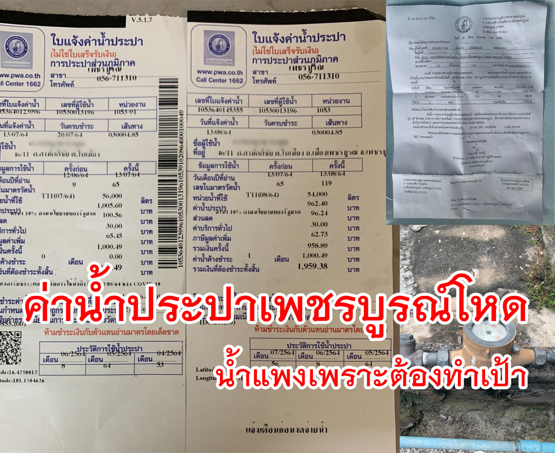 วันนี้ที่ 19 สิงหาคม 2564 ผู้สื่อข่าวรายงานว่า ที่หมู่บ้านในซอยสามัคคีชัย 3 เป็นบ้านทาวเฮ้าส์สองชั้น เลขที่ 46/11 ซอยสามัคคีชัย 3 ต.ในเมือง อ.เมือง จ.เพชรบูรณ์ เป็นบ้านพักอาศัย ไม่ได้จำหน่ายน้ำ ไม่ได้รับจ้างซักผ้า และไม่ได้เป็นสมาคม/มูลนิธิแต่อย่างใด แต่เหตุไฉนทำไมค่าน้ำประปาถึงได้แพงเกินกว่าเหตุ ว่า หลังจากผู้ใช้น้ำได้รับบิลค่าน้ำประจำเดือกรกฎาคม และสิงหาคม 2564 รวม 2 เดือน ที่มีจำนวนเงินที่ต้องชำระสูงถึง 1,959 บาท ซึ่งมากกว่าของเดือนที่แล้วแบบไม่น่าเชื่อ (เคยจ่ายไม่เกิน 300 กว่าบาท/เดือน) ผู้ใช้น้ำประปาเปิดเผยว่า การใช้น้ำเขาก็ใช้เป็นปกติ ซึ่งเขาเองก็ได้จ้างช่างมาสำรวจตรวจสอบทั้งภายในบ้านและนอกบ้านว่าจะมีจุดรั่วจุดแตกตรงไหนหรือไม่ ช่างได้บอกว่าถ้ามีน้ำรั่วน้ำแตกน้ำซึมจะต้องมีร่องรอยน้ำหรืออย่างน้อยก็จะมีความชื้นให้เห็น ผู้ใช้น้ำยังได้บอกอีกว่าตนคงทนไม่ไหวที่จะต้องมารับภาระค่าน้ำประปาเดือนละเป็นพัน ในขณะที่ตนไม่มีรายได้อะไรเพราะมีอาชีพเป็นแม่บ้านทำงานบ้า ประกอบอาหารเลี้ยงดูลูกหลานไปวันๆเท่านั้น