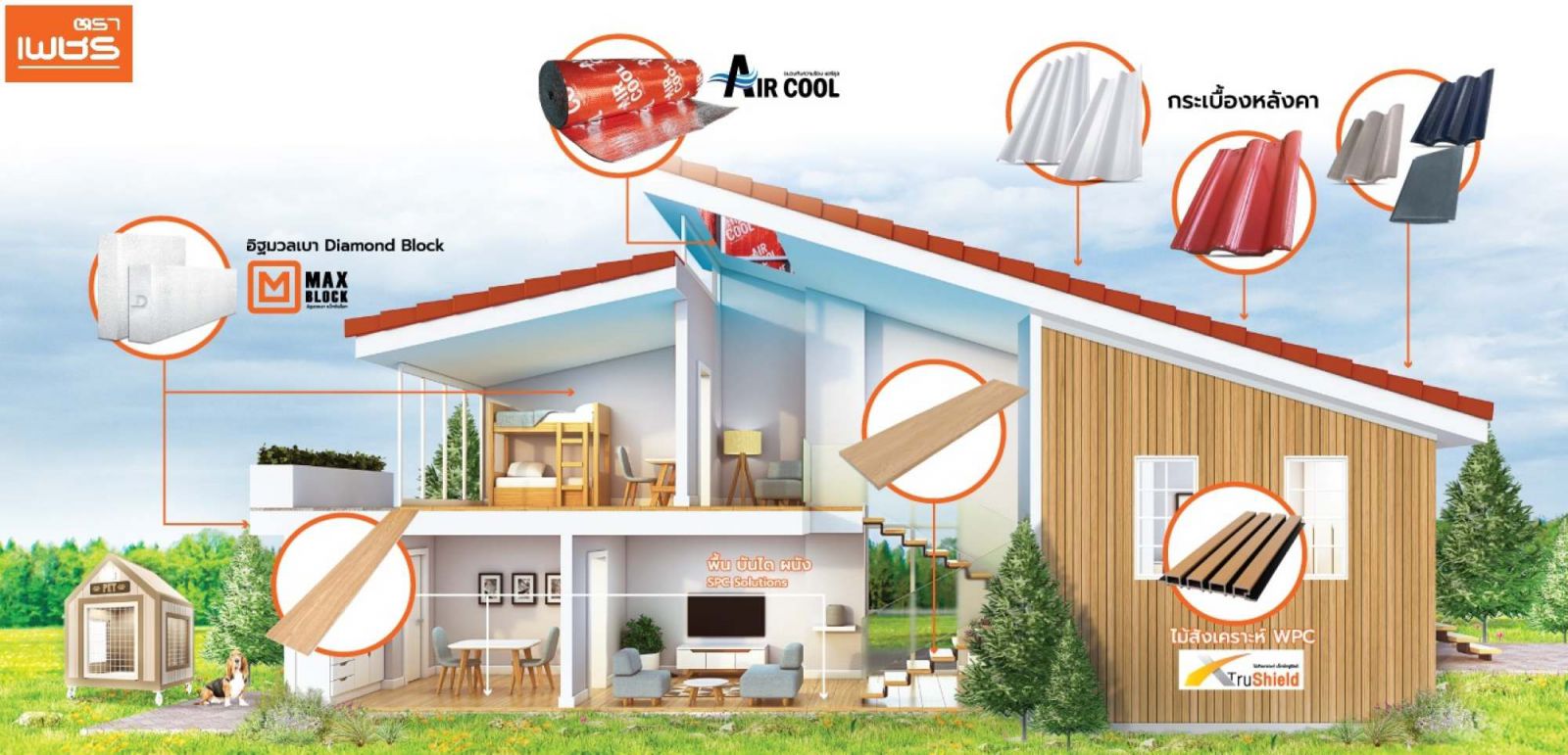 1) กลุ่มหลังคา อาทิ หลังคายูพีวีซี แอร์รูฟ ลดเสียงรบกวนจากฝนตกกระทบ ทั้งรุ่น Standard และ รุ่น Hollow, กระเบื้องจตุลอนและลอนคู่ วินเทอร์ไวท์ ที่มาพร้อมกับเทคโนโลยีสะท้อนความร้อน TSR สูงถึง 90%, หลังคาเหล็กเคลือบผิวด้วยหินธรรมชาติ Diamond Stone Coated ลดความร้อนและลดเสียงรบกวนได้ถึง 13 เดซิเบล, ฉนวนกันความร้อน แอร์คูล ความหนา 3 และ 8 มิลลิเมตร สะท้อนความร้อนได้ 95%, ฉนวนใยแก้ว Very Cool ความหนา 2 และ 3 นิ้ว ช่วยลดความร้อนจากใต้หลังคาเข้าสู่บ้าน และได้รับฉลากประหยัดพลังงาน และฝ้าระบายอากาศ ช่วยเพิ่มการระบายอากาศร้อนบริเวณใต้หลังคา ช่วยให้บ้านเย็นขึ้น