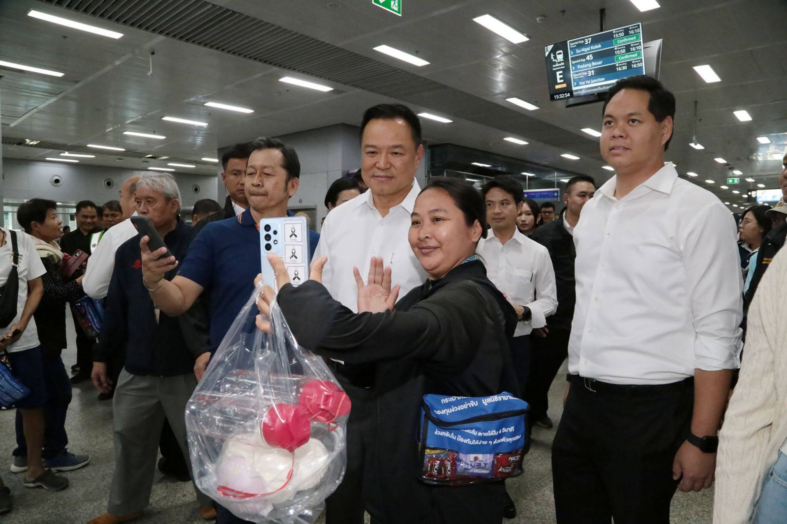 จากนั้นนายกฯ เดินขึ้นไปยังชานชาลาที่ 8 เข้าตรวจเยี่ยมขบวนรถไฟปรับอากาศนั่งและนอนชั้น 2 สายกรุงเทพฯ-ปาดังเบซาร์ และได้ทักทายผู้โดยสาร รวมถึงให้กำลังใจเจ้าหน้าที่ที่ปฏิบัติงาน ให้ทำงานอย่างเต็มที่เพื่อบริการพี่น้องประชาชน โดยมีประชาชนจำนวนมากเข้ามาขอถ่ายรูปด้วย