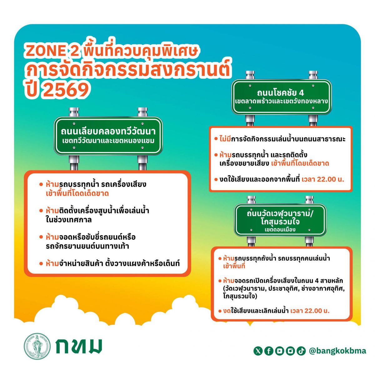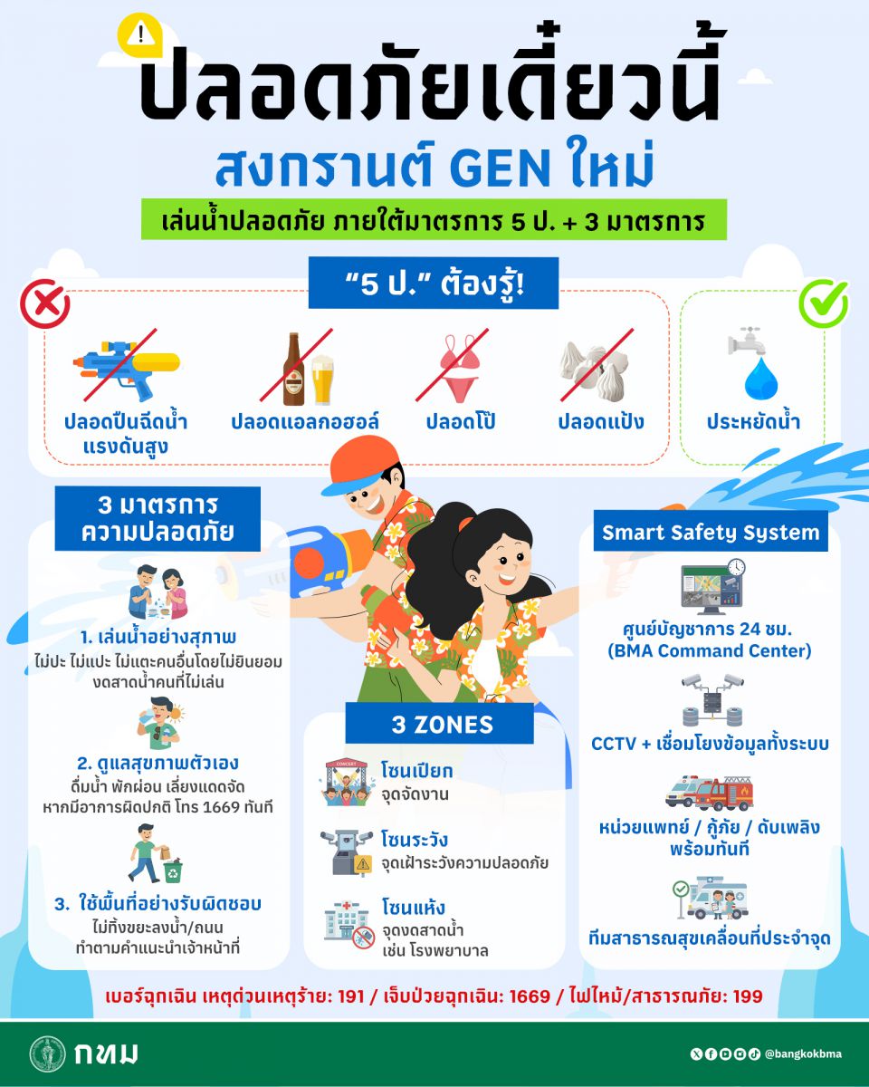 ในปีนี้ กทม. ได้เน้นย้ำมาตรการ 5 ป. ได้แก่ ปลอดปืนฉีดน้ำแรงดันสูง ปลอดแอลกอฮอล์ ปลอดโป๊ ปลอดแป้ง และประหยัดน้ำ พร้อม 3 มาตรการเสริมเพื่อความปลอดภัยยิ่งขึ้น ได้แก่ เล่นสุภาพ ดูแลสุขภาพ และใช้พื้นที่สาธารณะอย่างมีความรับผิดชอบ