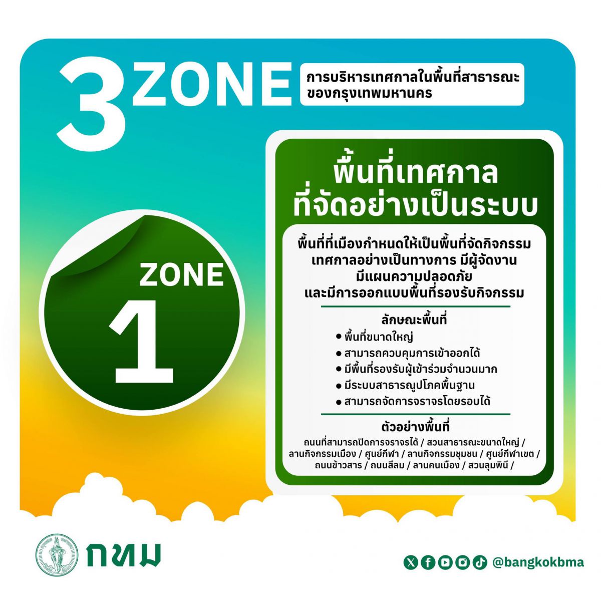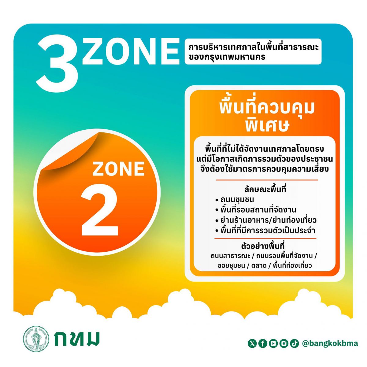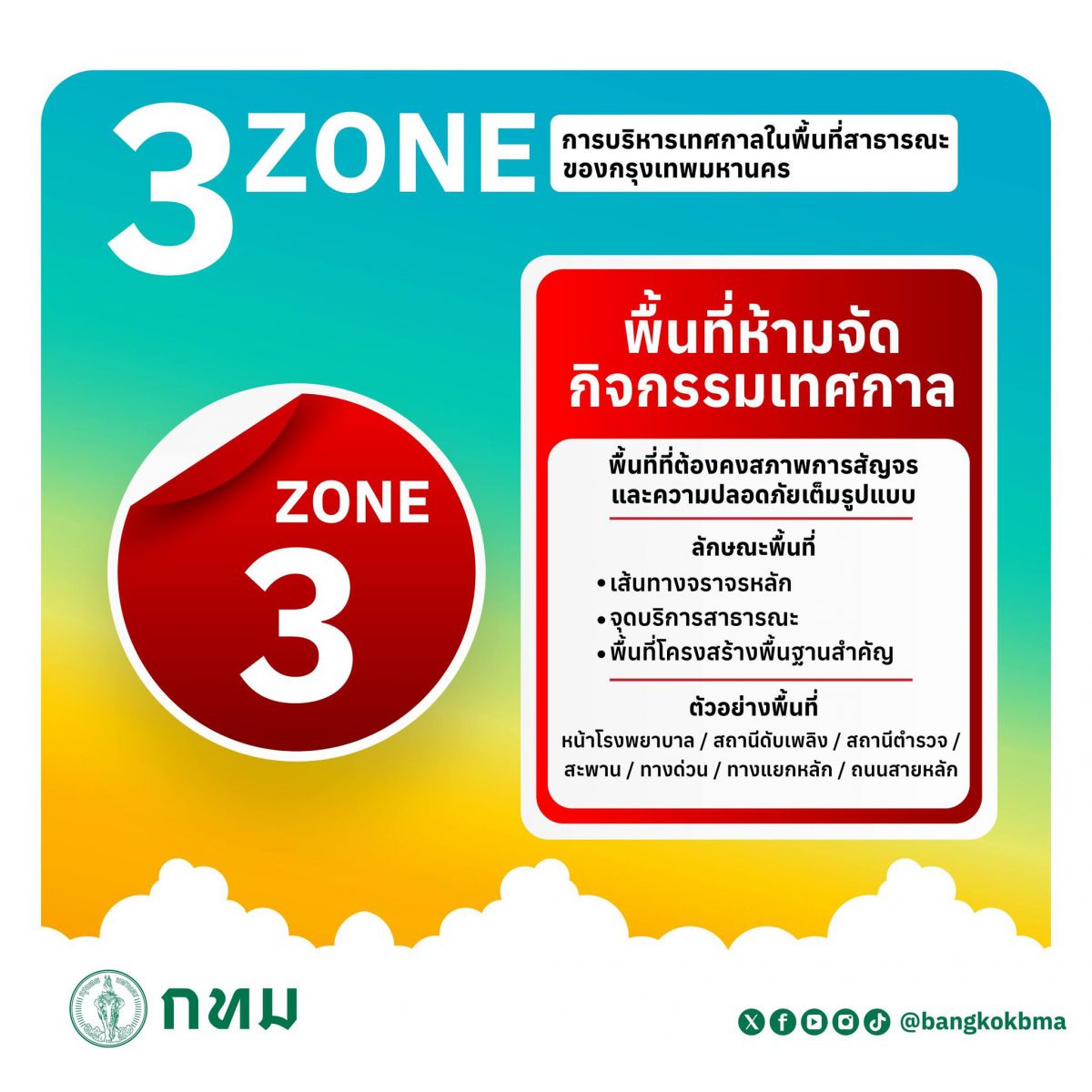 - โซน 3 พื้นที่ห้ามจัดกิจกรรม เพื่อความคล่องตัวในการสัญจรและความปลอดภัยเต็มรูปแบบ เช่น ถนนสายหลัก หรือบริเวณโครงสร้างสำคัญ เช่น โรงพยาบาล และสถานีดับเพลิง