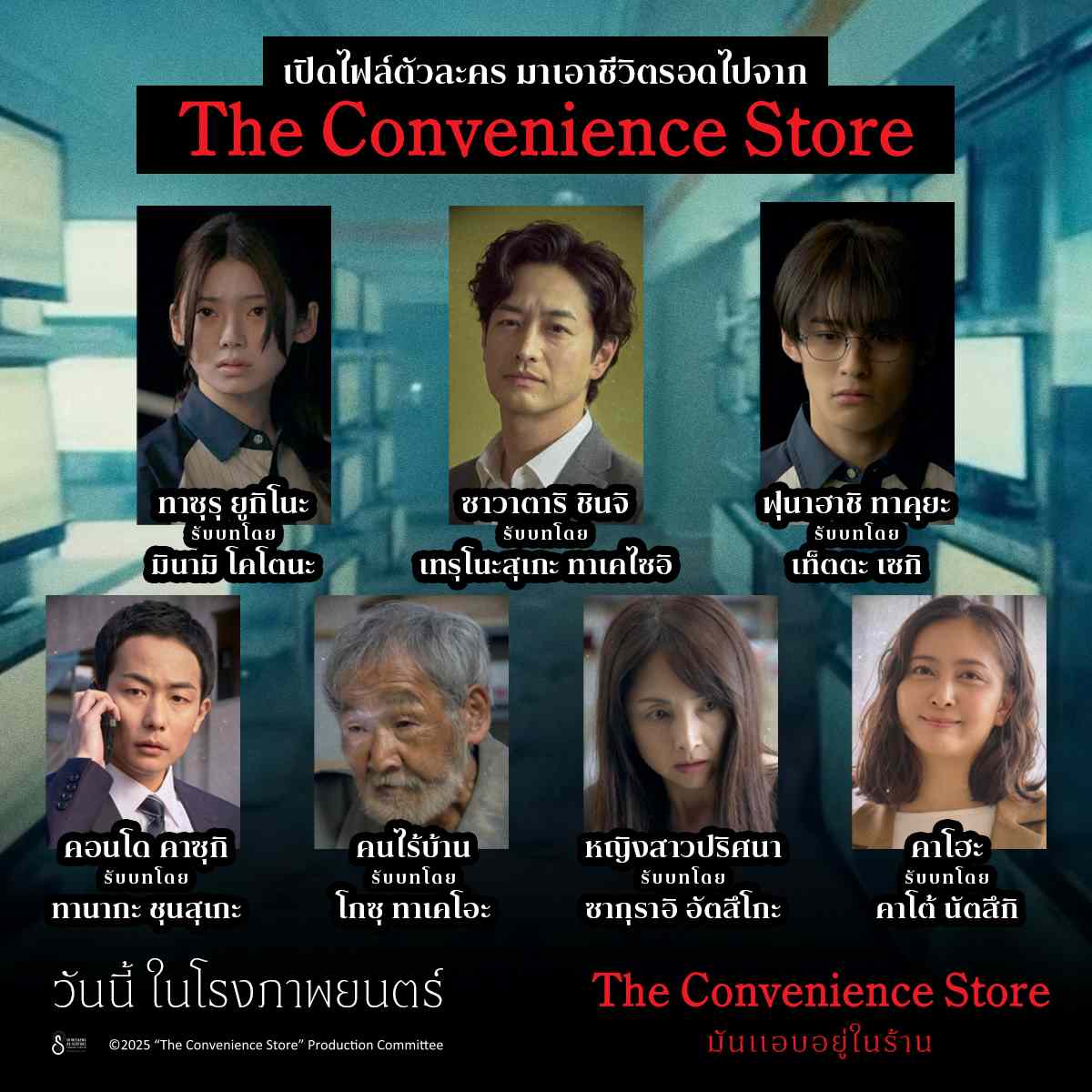 และก่อนตอกบัตรพร้อมเข้ากะดึกมารู้จักนักแสดงที่รับบท 7 ตัวละครหลัก เพื่อร่วมไขปริศนาความลี้ลับในร้านสะดวกซื้อแห่งนี้ ไม่ว่าจะเป็น ทาซุรุ ยูกิโนะ รับบทโดย มินามิ โคโตนะ, ซาวาตาริ ชินจิ รับบทโดย เทรุโนะสุเกะ ทาเคไซอิ, ฟุนาฮาชิ ทาคุยะ รับบทโดย เท็ตตะ เซกิ, คอนโด คาซุกิ รับบทโดย ทานากะ ชุนสุเกะ, คนไร้บ้าน รับบทโดย โกซุ ทาเคโอะ, หญิงสาวปริศนา รับบทโดย ซากุราอิ อัตสึโกะ, คาโฮะ รับบทโดย คาโต้ นัตสึกิ ซึ่งล้วนเป็นส่วนสำคัญของเรื่องราวที่ค่อย ๆ คลี่คลายในค่ำคืนที่ไม่มีอะไรเหมือนเดิม