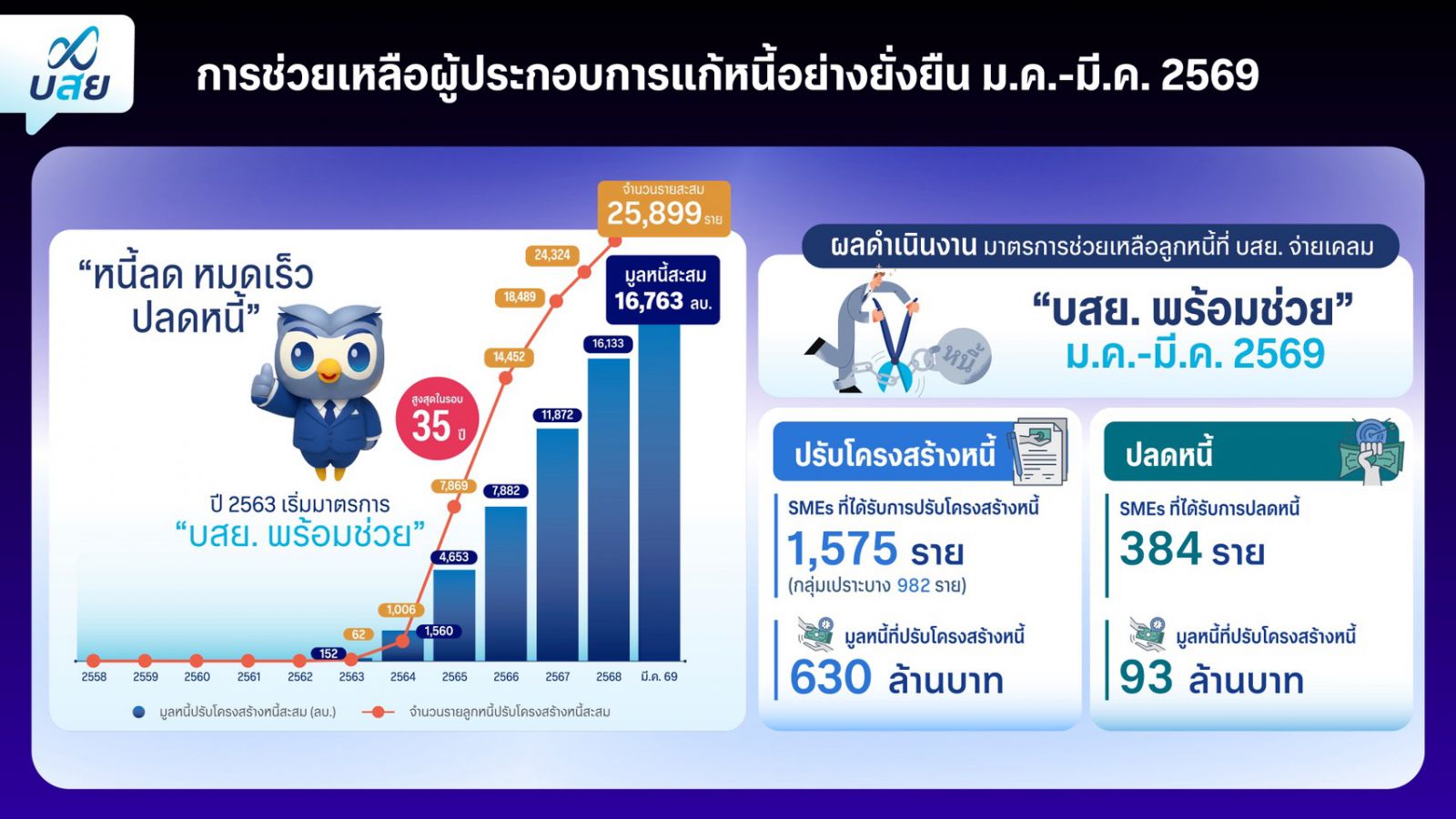 นอกจากช่วย SMEs รายย่อย เข้าถึงสินเชื่อแล้ว บสย. ยังมุ่งช่วย SMEs ที่ถูกจ่ายเคลม ผ่านการปรับโครงสร้างหนี้ ตามมาตรการ “บสย. พร้อมช่วย” โดยไตรมาสที่ 1 ประสบความสำเร็จในการช่วยลูกหนี้ ปรับโครงสร้างหนี้รวม 25,899 ราย คิดเป็นมูลหนี้รวม 16,763 ล้านบาท (ตั้งแต่ออกมาตรการในปี 2563 ถึงไตรมาส 1 ปี 2569) เฉพาะไตรมาสที่ 1 ช่วยลูกหนี้ปรับโครงสร้างหนี้ได้ 1,575 ราย คิดเป็นมูลหนี้ 630 ล้านบาท และสามารถช่วยลูกหนี้ “ปลดหนี้” ปิดบัญชี ได้สูงถึง 384 ราย คิดเป็นมูลหนี้ 93 ล้านบาท นอกจากนี้ยังเดินหน้าช่วยเหลือลูกหนี้ “กลุ่มเปราะบาง” (ยอดหนี้คงเหลือไม่เกิน 2 แสนบาท) ภายใต้มาตรการ บสย. พร้อมช่วย ที่ต้องการปลดหนี้ ปิดบัญชี มอบส่วนลดเงินต้นสูงสุด 50% และลดต้นสูงสุด 40% สำหรับลูกหนี้ SMEs ยอดหนี้คงเหลือมากกว่า 2 แสนบาท พร้อมกันนี้ ยังเตรียมจัดกิจกรรมเชิงรุกต่างๆ อาทิ กิจกรรม “บสย. พร้อมค้ำ พร้อมช่วย ปี 2” ส่งผู้เชี่ยวชาญทางการเงินลงพื้นที่ไปยังภูมิภาคต่างๆ เพื่อสานต่อการช่วยเหลือลูกหนี้ บสย. พร้อมให้คำปรึกษาทางการเงินแก่ SMEs ทั่วไป โดยสามารถติดตามข้อมูลและรายละเอียดของกิจกรรม ผ่านช่องทางออนไลน์ของ บสย.