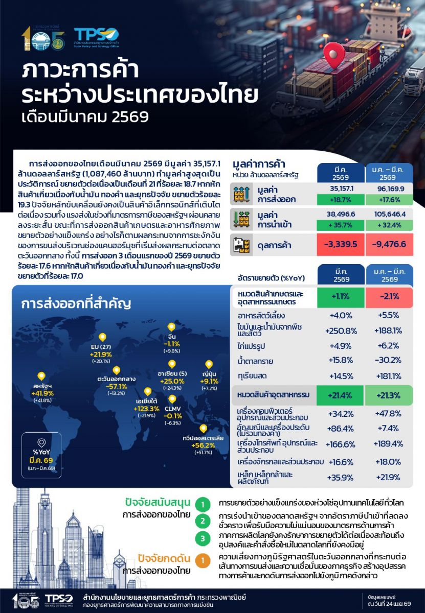 กรุงเทพฯ-นายนันทพงษ์ จิระเลิศพงษ์ ผู้อำนวยการสำนักงานนโยบายและยุทธศาสตร์การค้า (สนค.) แถลงการส่งออกของไทยในเดือนมีนาคม 2569 มีมูลค่า 35,157.1 ล้านดอลลาร์สหรัฐ (1,087,460 ล้านบาท) ทำมูลค่าสูงสุดเป็นประวัติการณ์ โดยขยายตัวต่อเนื่องเป็นเดือนที่ 21 ที่ร้อยละ 18.7 หากหักสินค้าเกี่ยวเนื่องกับน้ำมัน ทองคำ และยุทธปัจจัย ขยายตัวที่ร้อยละ 19.3 ปัจจัยหลักขับเคลื่อนการส่งออกยังคงเป็นสินค้าอิเล็กทรอนิกส์และเครื่องใช้ไฟฟ้าที่เติบโตตามความต้องการสินค้าเทคโนโลยี AI และ Data Center ที่เพิ่มสูงขึ้นอย่างต่อเนื่อง รวมทั้งแรงส่งในช่วงที่มาตรการทางภาษีของสหรัฐฯ ผ่อนคลายลงระยะสั้น ขณะที่การส่งออกสินค้าเกษตรและอาหารศักยภาพขยายตัวอย่างแข็งแกร่ง เช่น ทุเรียนสด มังคุดสด เนื้อสุกร และอาหารสัตว์เลี้ยง เป็นต้น อย่างไรก็ตามผลกระทบจากการชะงักงันของการขนส่งบริเวณช่องแคบฮอร์มุซที่ไม่สงบเริ่มส่งสัญญาณในตลาดตะวันออกกลางที่กลับมาหดตัว ทั้งนี้ การส่งออก 3 เดือนแรกของปี 2569 ขยายตัวที่ร้อยละ 17.6 หากหักสินค้าเกี่ยวเนื่องกับน้ำมัน ทองคำ และยุทธปัจจัย ขยายตัวที่ร้อยละ 17.0