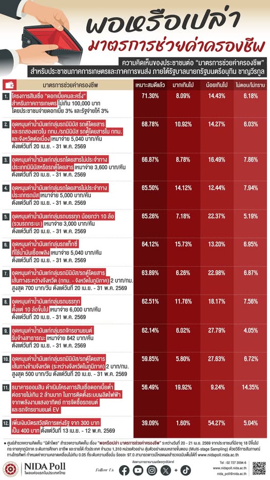 - อุดหนุนค่าน้ำมันแก่กลุ่มรถมินิบัส รถตู้โดยสาร และรถสองแถว ใน กทม./รถมินิบัส รถตู้โดยสาร ใน กทม. และจังหวัดต่อเนื่องเหมาจ่าย 5,040 บาท/คัน ตั้งแต่วันที่ 20 เม.ย. – 31 พ.ค. 2569 ตัวอย่าง ร้อยละ 68.78 ระบุว่า เหมาะสมดีแล้ว รองลงมา ร้อยละ 14.27 ระบุว่า น้อยเกินไป ร้อยละ 10.92 ระบุว่า มากเกินไป และร้อยละ 6.03 ระบุว่า ไม่ตอบ/ไม่ทราบ