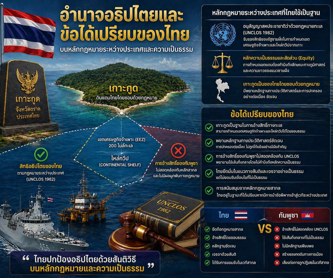 ในเชิงกฎหมายระหว่างประเทศ ไทยถูกมองว่ามี “ข้อได้เปรียบ” ในหลายมิติ โดยเฉพาะอย่างยิ่งในประเด็นที่เกี่ยวข้องกับเกาะกูด ซึ่งเป็นจุดยุทธศาสตร์สำคัญในการกำหนดเส้นเขตแดนทางทะเล