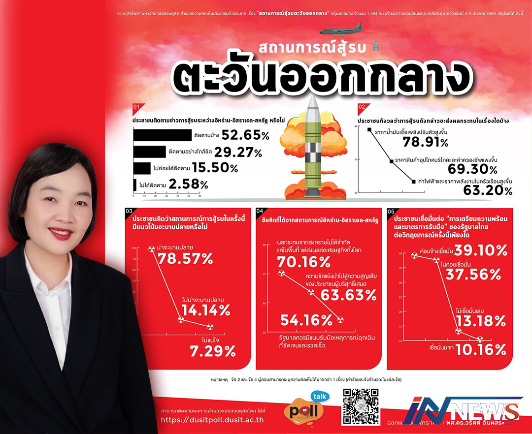 กรุงเทพฯ-สวนดุสิตโพลเปิดผลสำรวจชี้ประชาชนไทย 78.9% กังวลหนัก “สงครามอิหร่าน-อิสราเอล-สหรัฐ” ดันราคาน้ำมันเชื...