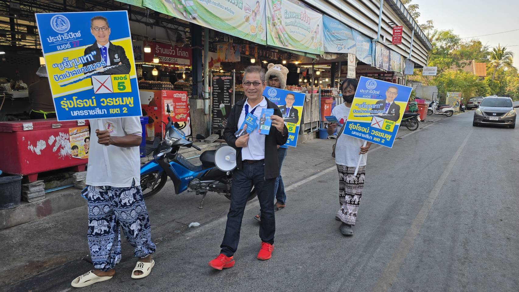 'เกิบแดงไม่หยุดเดิน'รุ่งโรจน์เขต2โคราช ลุยตลาดขอคะแนนหนุนพรรคปชป.