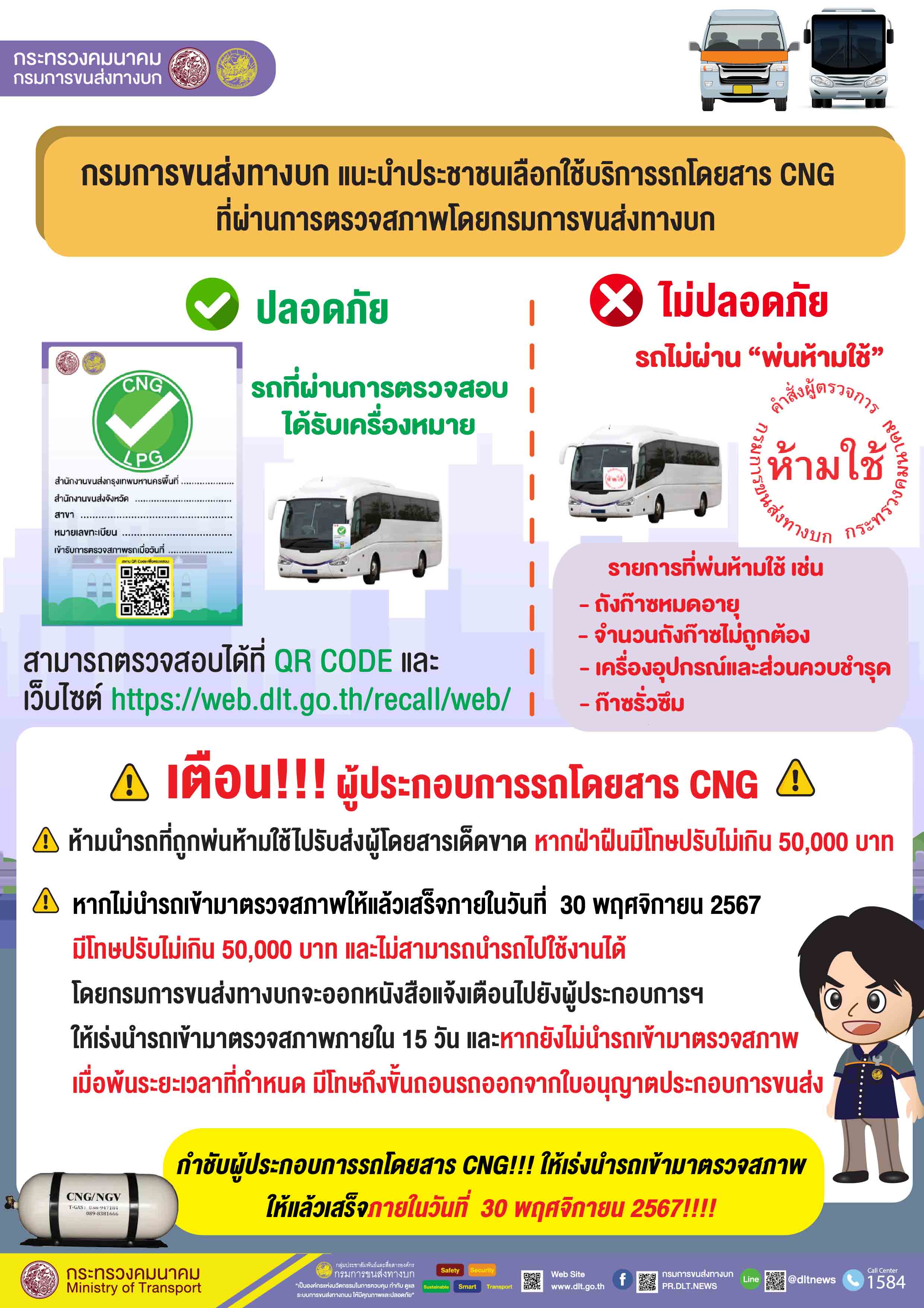 กรมการขนส่งทางบก เตือนผู้ประกอบการรถโดยสาร CNG ต้องนำรถเข้ามาตรวจสภาพให้แล้วเสร็จภายใน 30 พฤศจิกายน 2567 หากไม่นำมารถมาต...