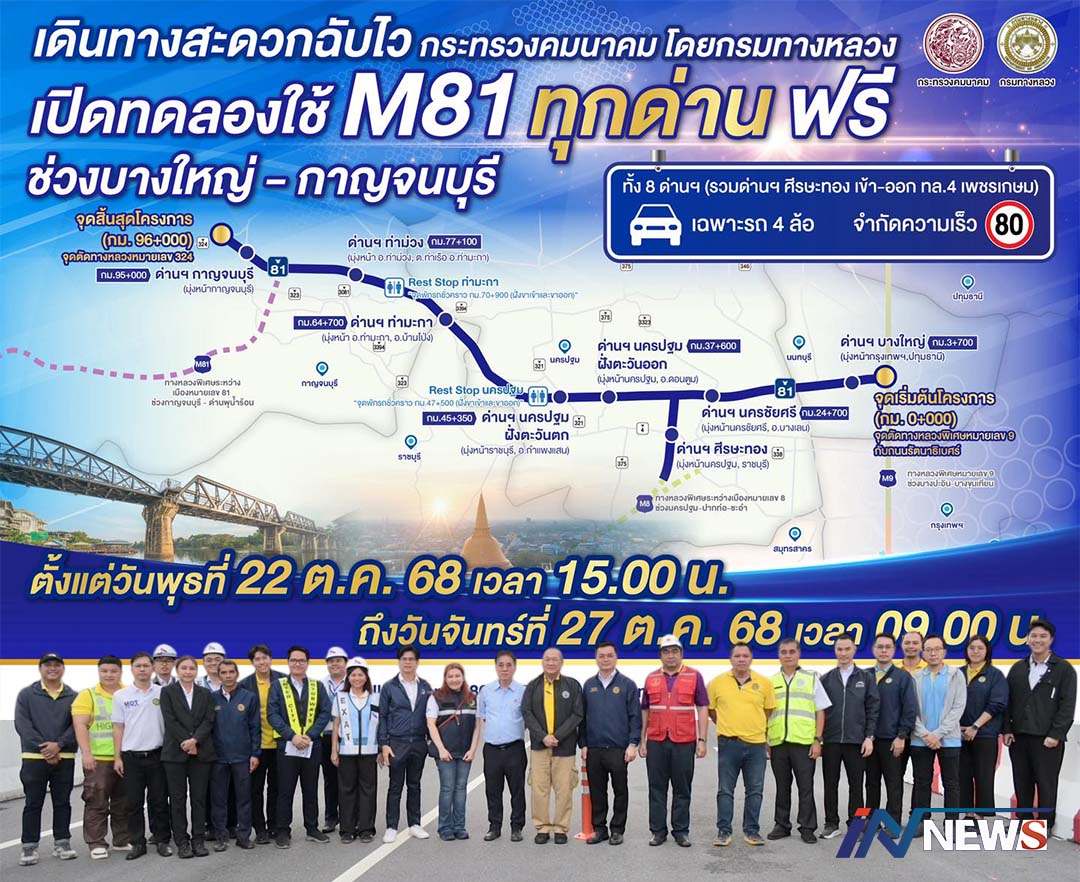 กรุงเทพฯ-กรมทางหลวงเปิดทดลองให้บริการมอเตอร์เวย์ M81 “ตลอดสายทาง” ระหว่างวันพุธที่ 22 ต.ค. 68 เวลา 15.00 น. ...
