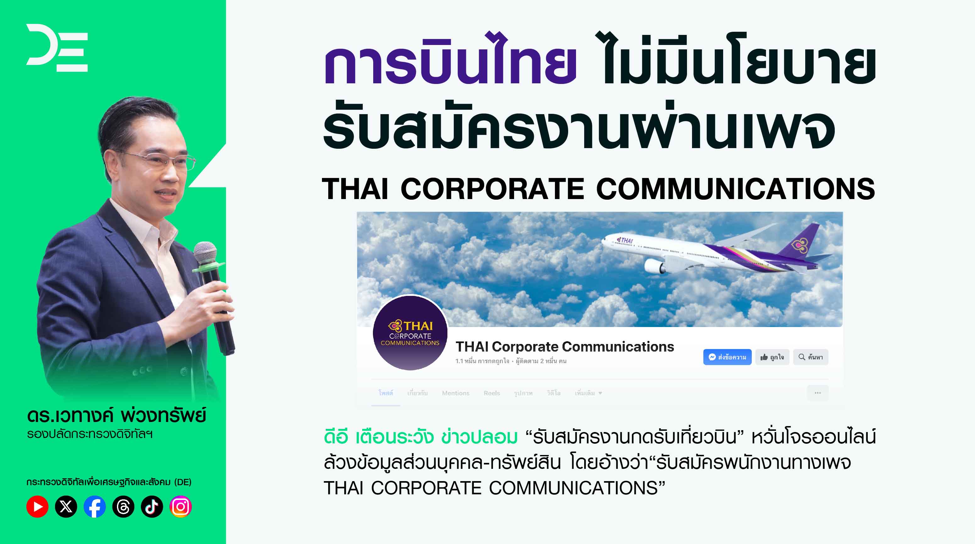 ดีอีเตือนระวังข่าวปลอมหวั่นโจรออนไลน์ 'รับสมัครงานกดรับเที่ยวบิน'