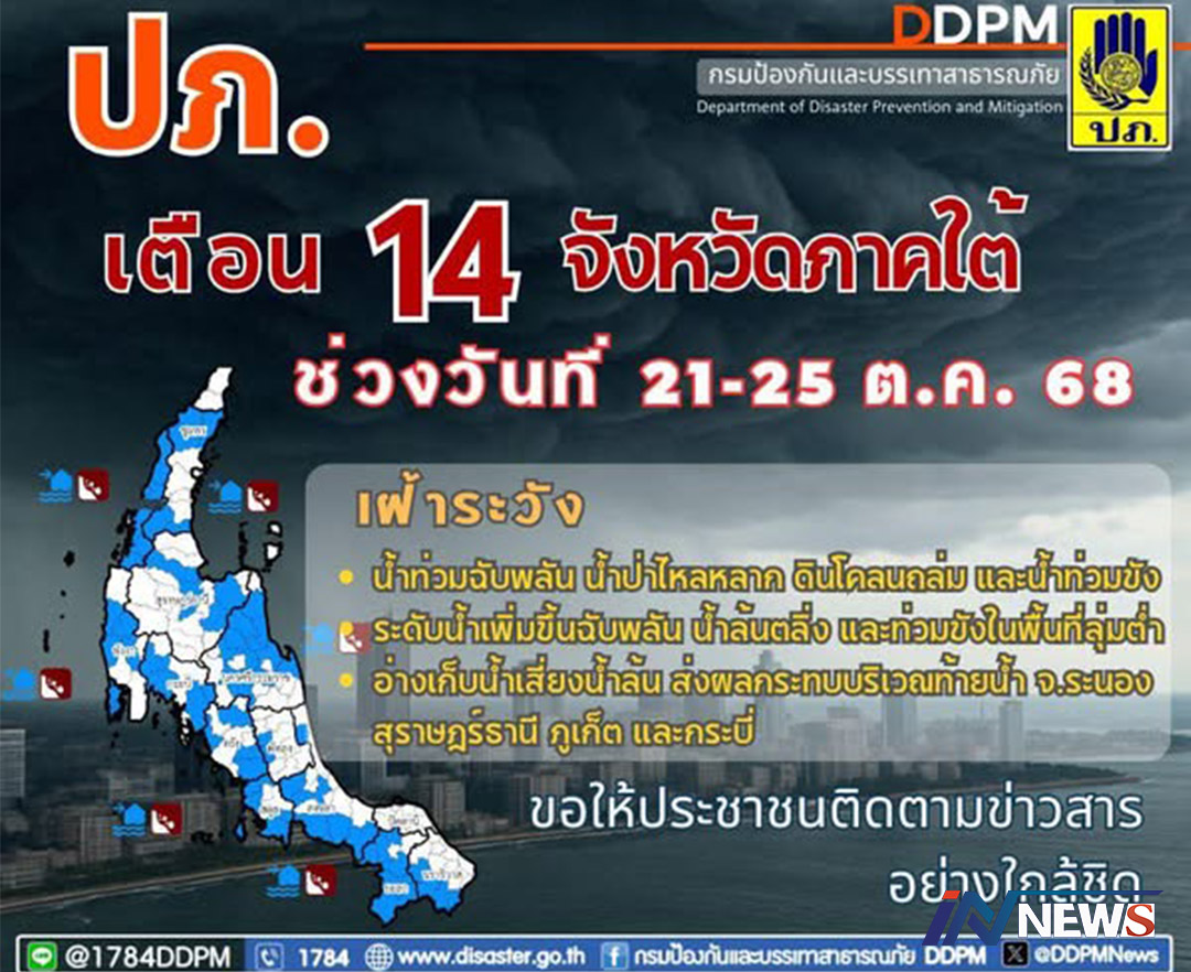 กรุงเทพฯ-ปภ. แจ้งเตือน 14 จังหวัดภาคใต้ เฝ้าระวังสถานการณ์น้ำท่วมฉับพลัน น้ำป่าไหลหลาก ดินโคลนถล่ม น้ำท่วมขัง และระดับน้...