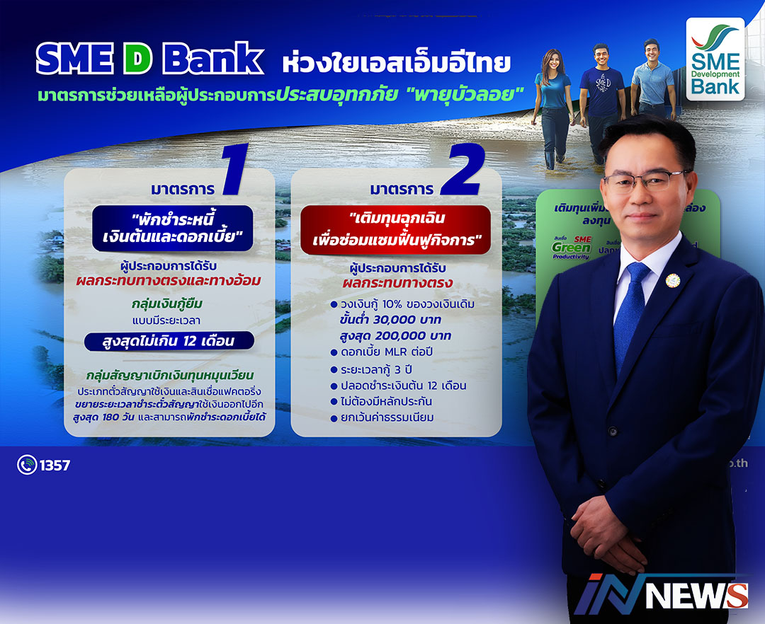 กรุงเทพฯ-SME D Bank ออกมาตรการเร่งด่วน ช่วยเหลือผู้ประกอบการเอสเอ็มอีได้รับผลกระทบจากอิทธิพลพายุ “บัวลอย” ใน...