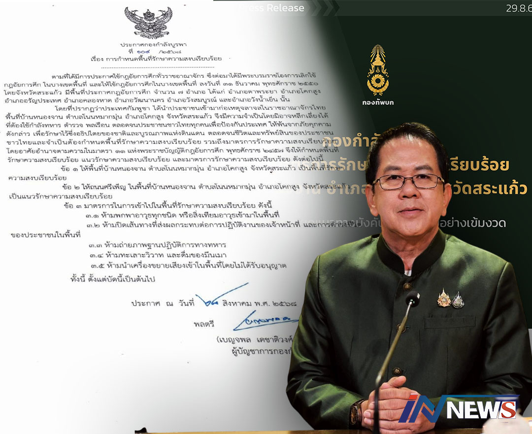 กรุงเทพฯ-ศบ.ทก. กองทัพภาคที่ 1 ประกาศให้ “บ้านหนองจาน“ สระแก้วเป็นพื้นที่รักษาความสงบเรียบร้อย และรายงานสถาน...