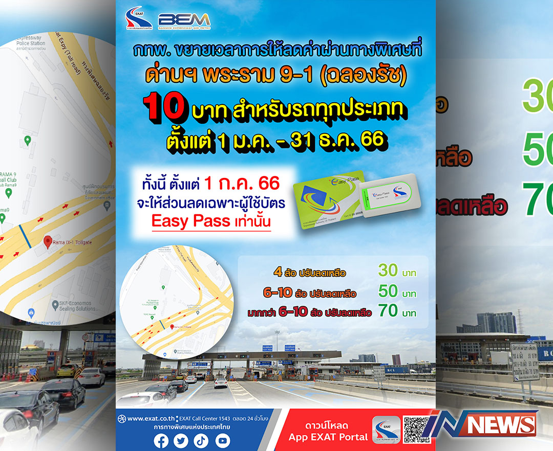กรุงเทพฯ-กทพ. ขยายเวลาการให้ลดค่าผ่านทางพิเศษ 10 บาท ที่ด่านฯ พระราม 9-1 (ฉลองรัช) สำหรับรถทุกประเภท ตั้งแต่ 1 มกราคม - ...