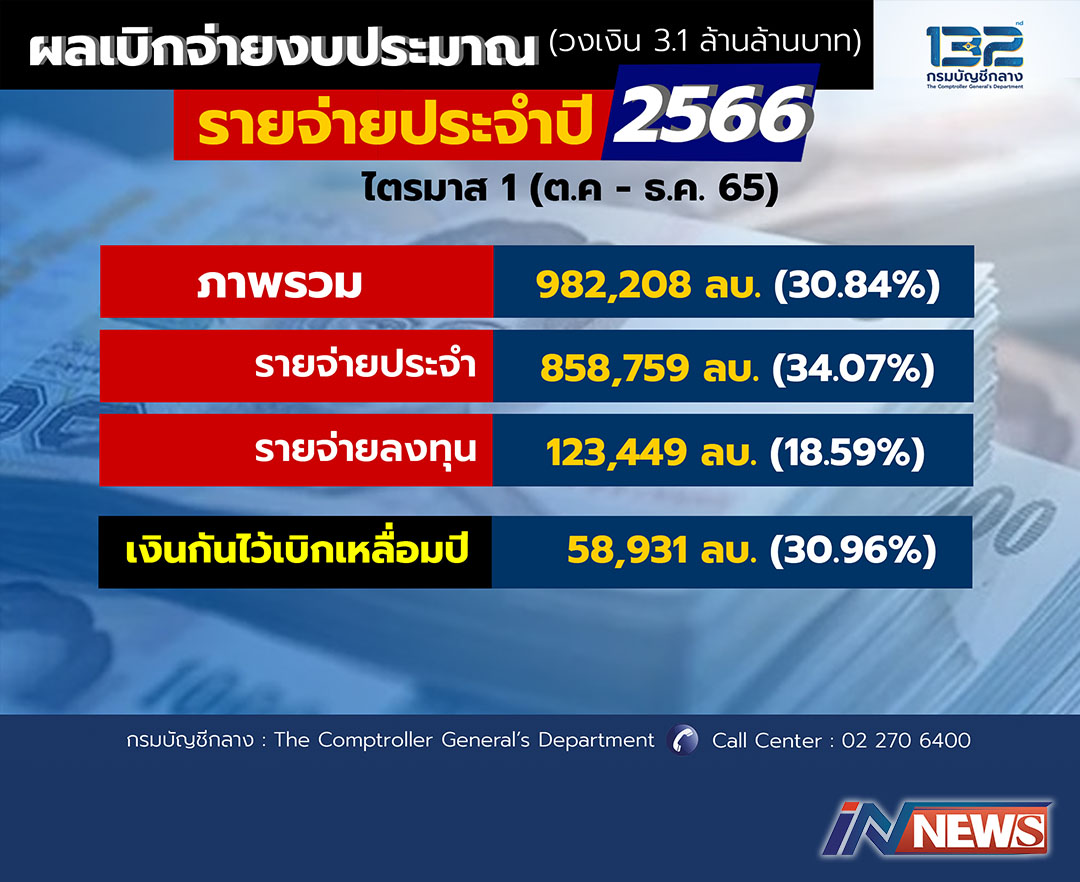 กรุงเทพฯ-สำหรับผลการเบิกจ่ายเงินงบประมาณรายจ่ายประจำปีงบประมาณ พ.ศ. 2566 ไตรมาสที่ 1 (ต.ค - ธ.ค. 65) ภาพรวมเบิกจ่ายแล้ว ...
