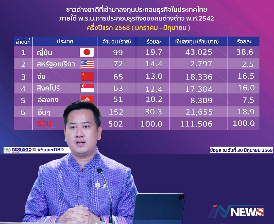 กรุงเทพฯ-ไทยยังน่าลงทุน หลังพบต่างชาติเชื่อมั่นไทย ครึ่งปีแรกของปี 2568 (ม.ค.-มิ.ย.) ลงทุนในไทย 502 ราย เงินลงทุนรวมทั้ง...
